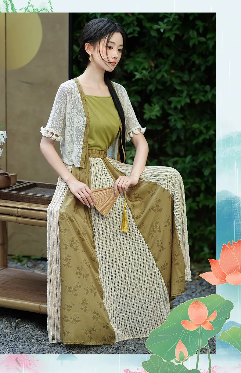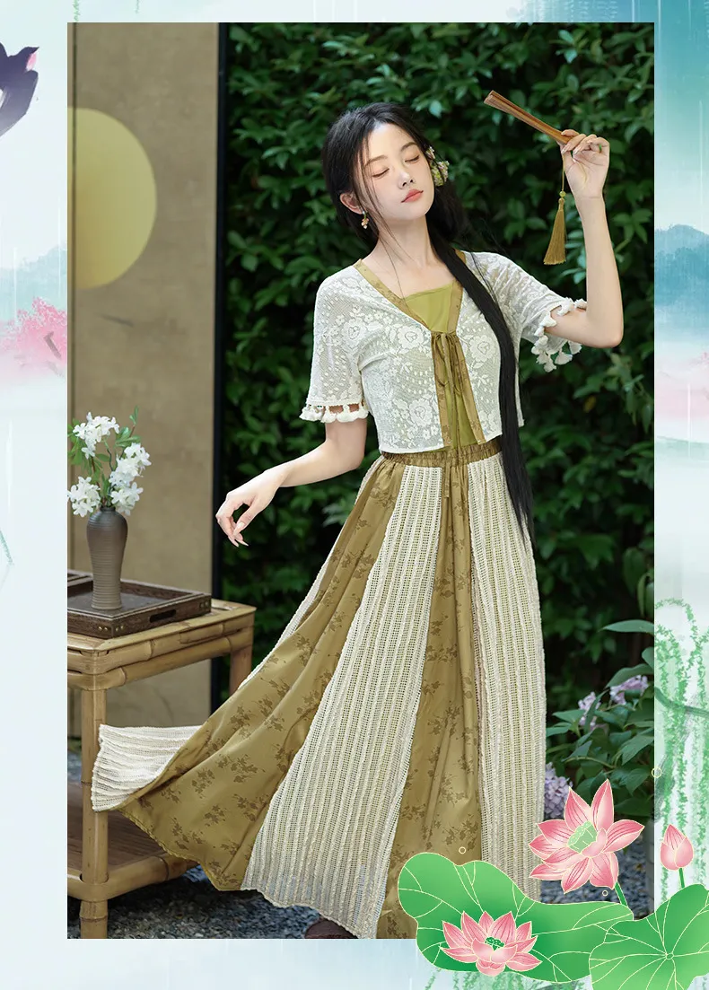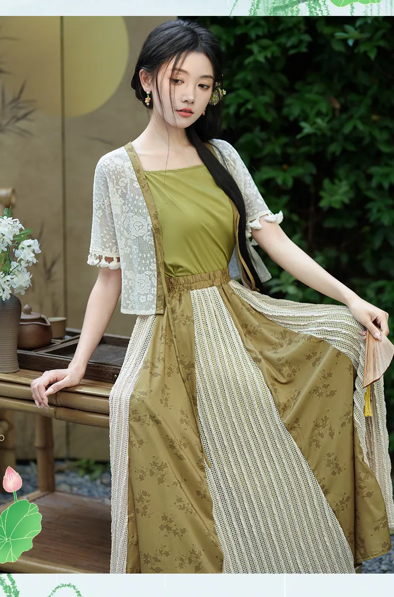衣都精品- 新款中式圓領印花喇叭袖復古漢服上衣+半身裙兩件式套裝