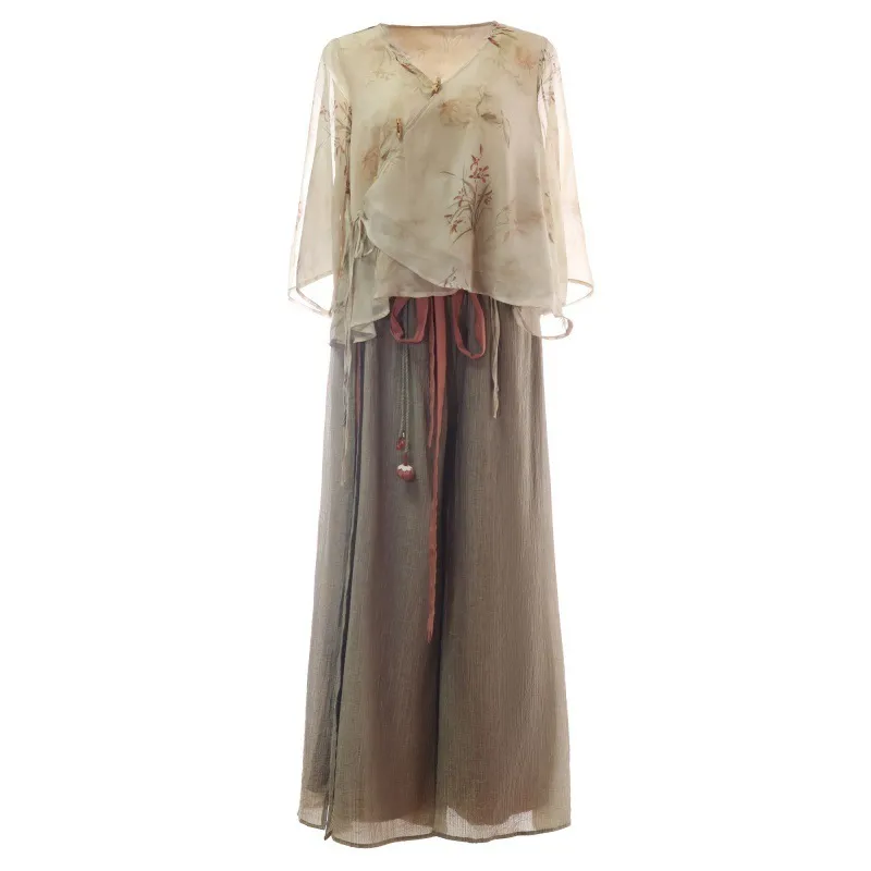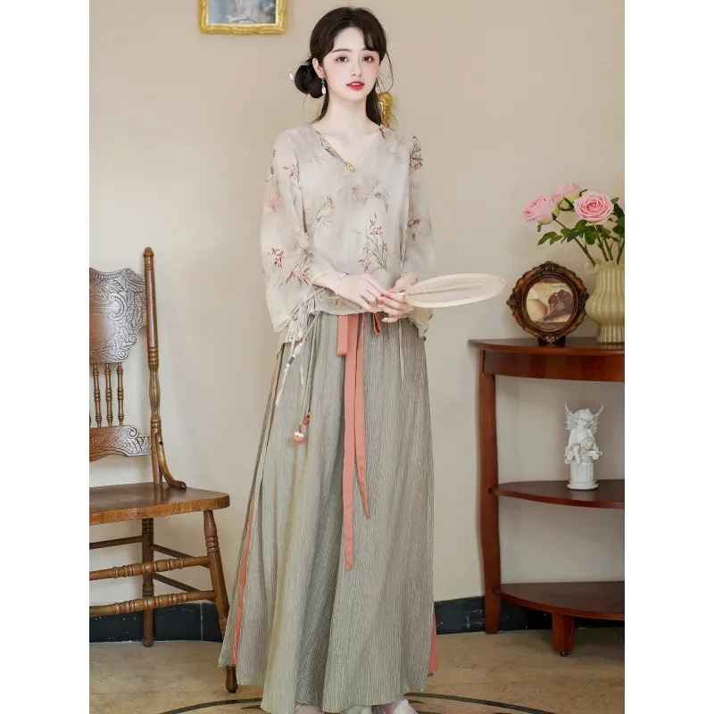 衣都精品- 新款中式圓領印花喇叭袖復古漢服上衣+半身裙兩件式套裝