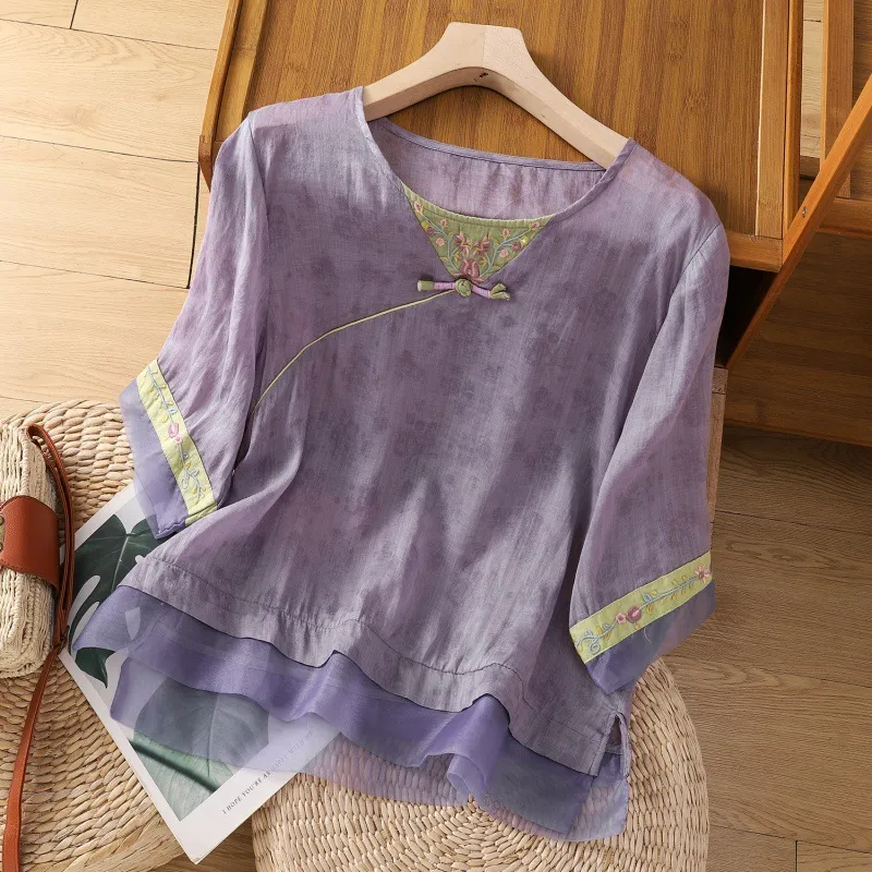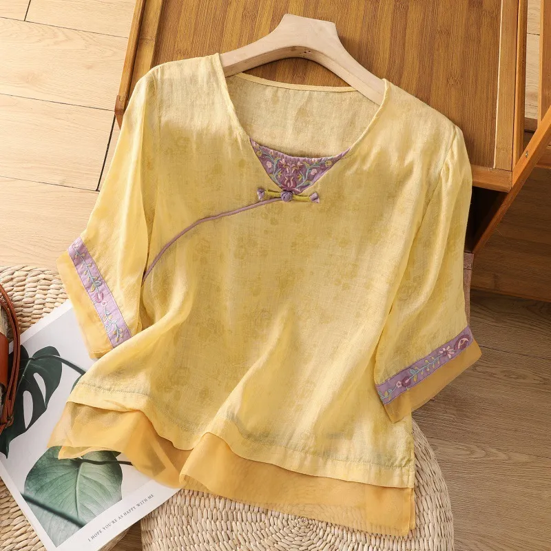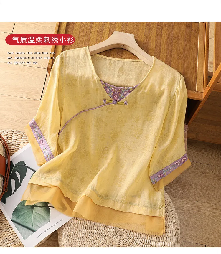 衣都精品- 新款中式文藝復古提花歐根紗拼接刺繡薄款上衣