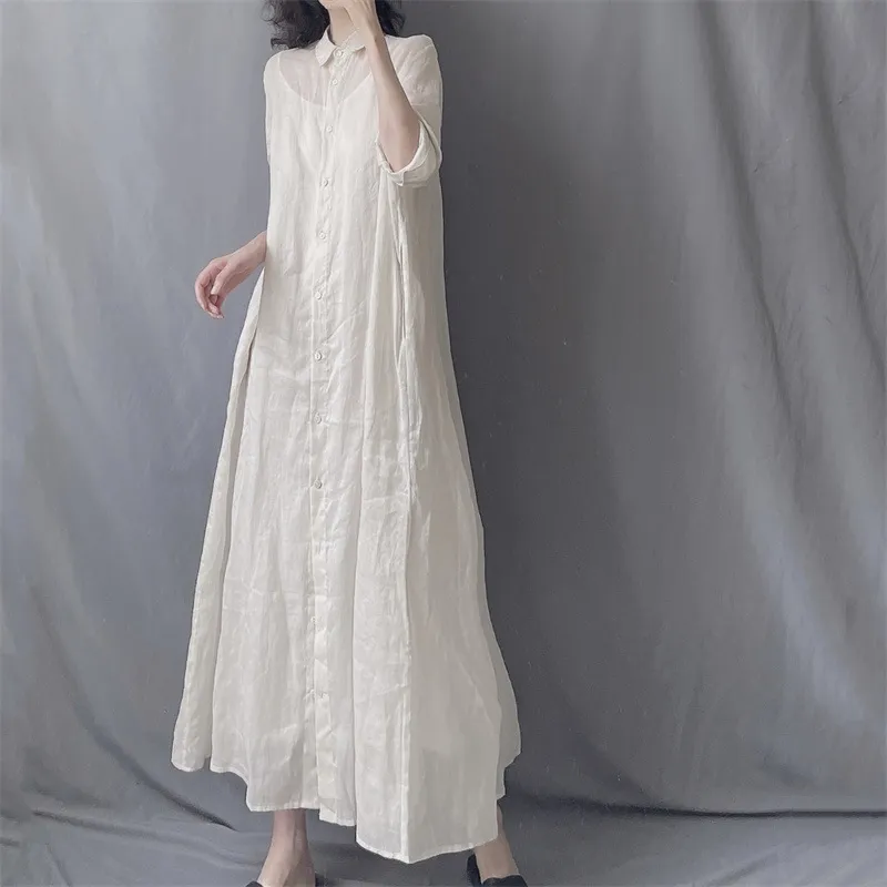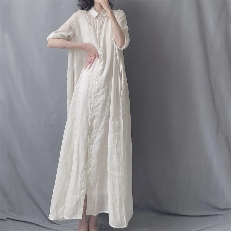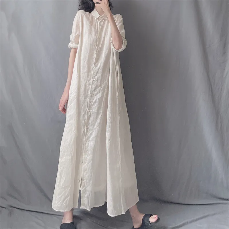 衣都精品- 新款文藝寬鬆翻領純色飄逸連衣裙