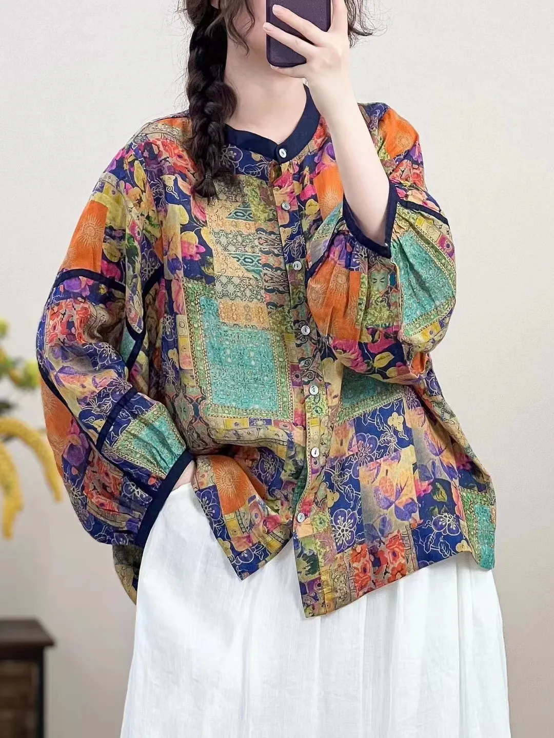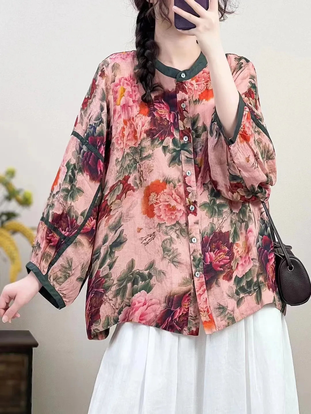 衣都精品- 新款大碼開襟衫休閒立領印花苧麻上衣