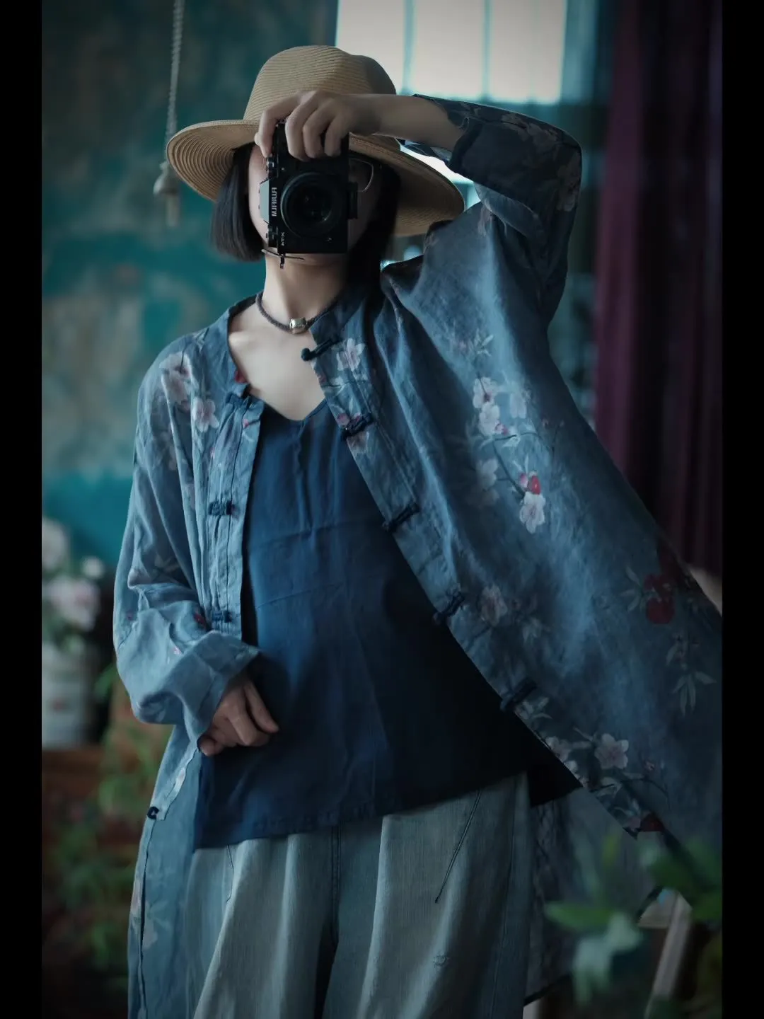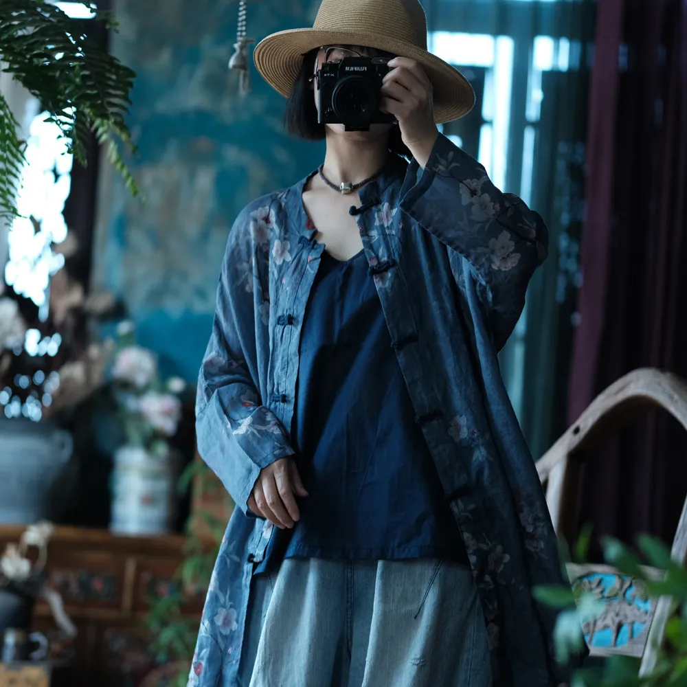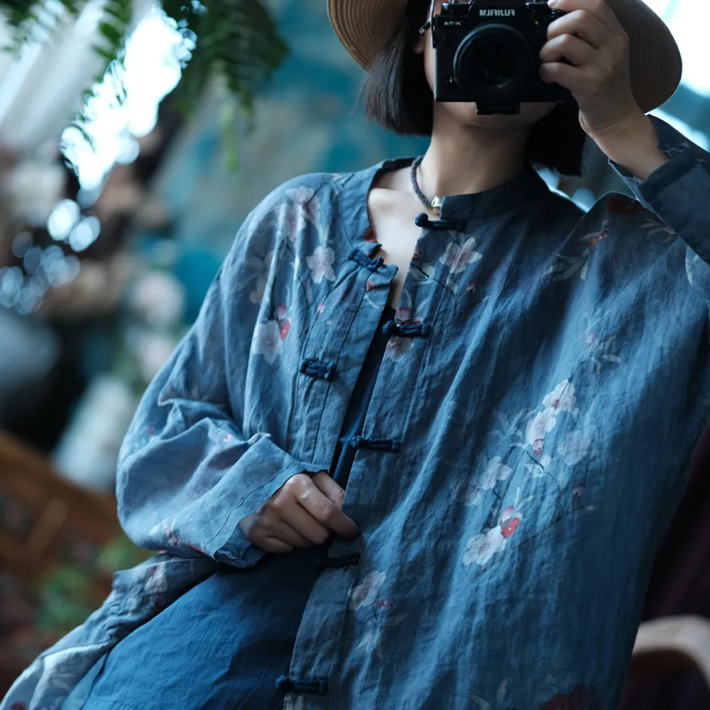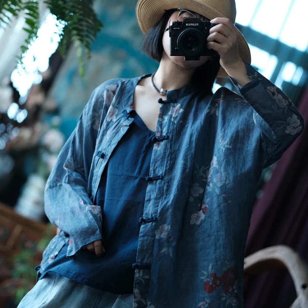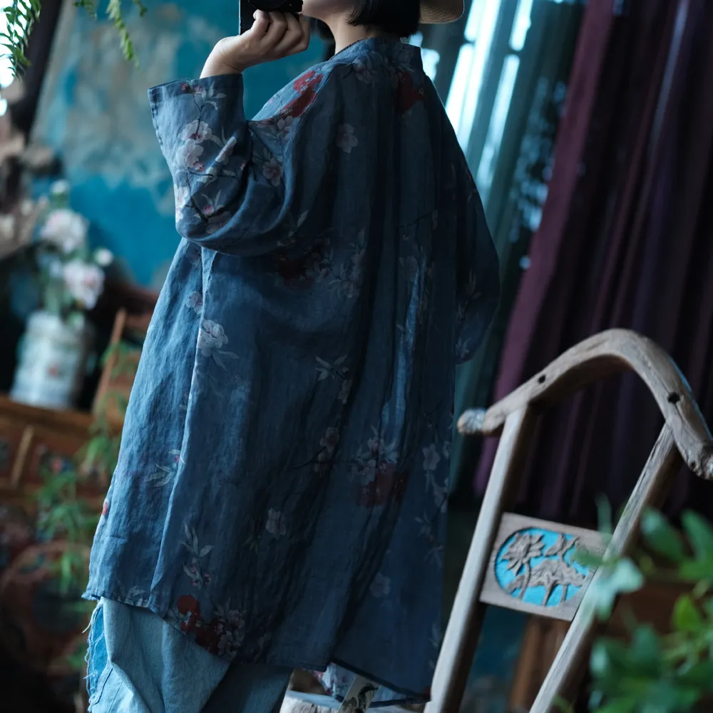 衣都精品- 新款復古文藝亞麻印花開襟上衣