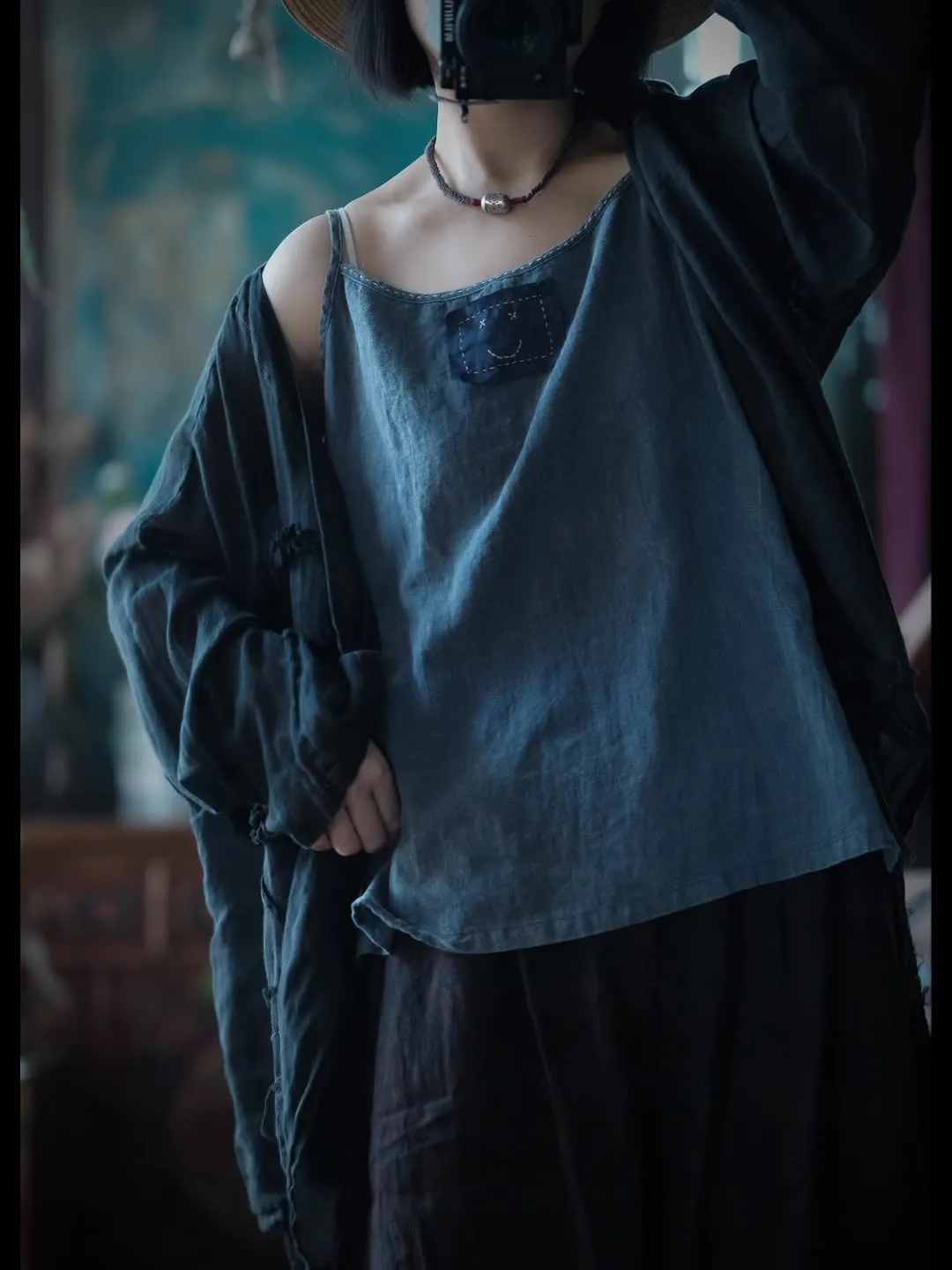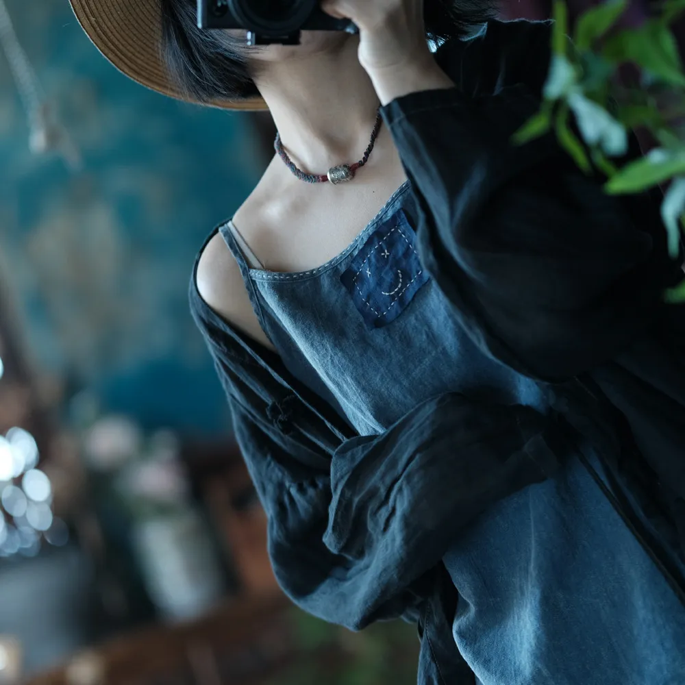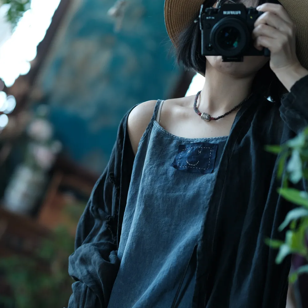 衣都精品- 新款文藝百搭雪花洗貼布寬鬆吊帶上衣