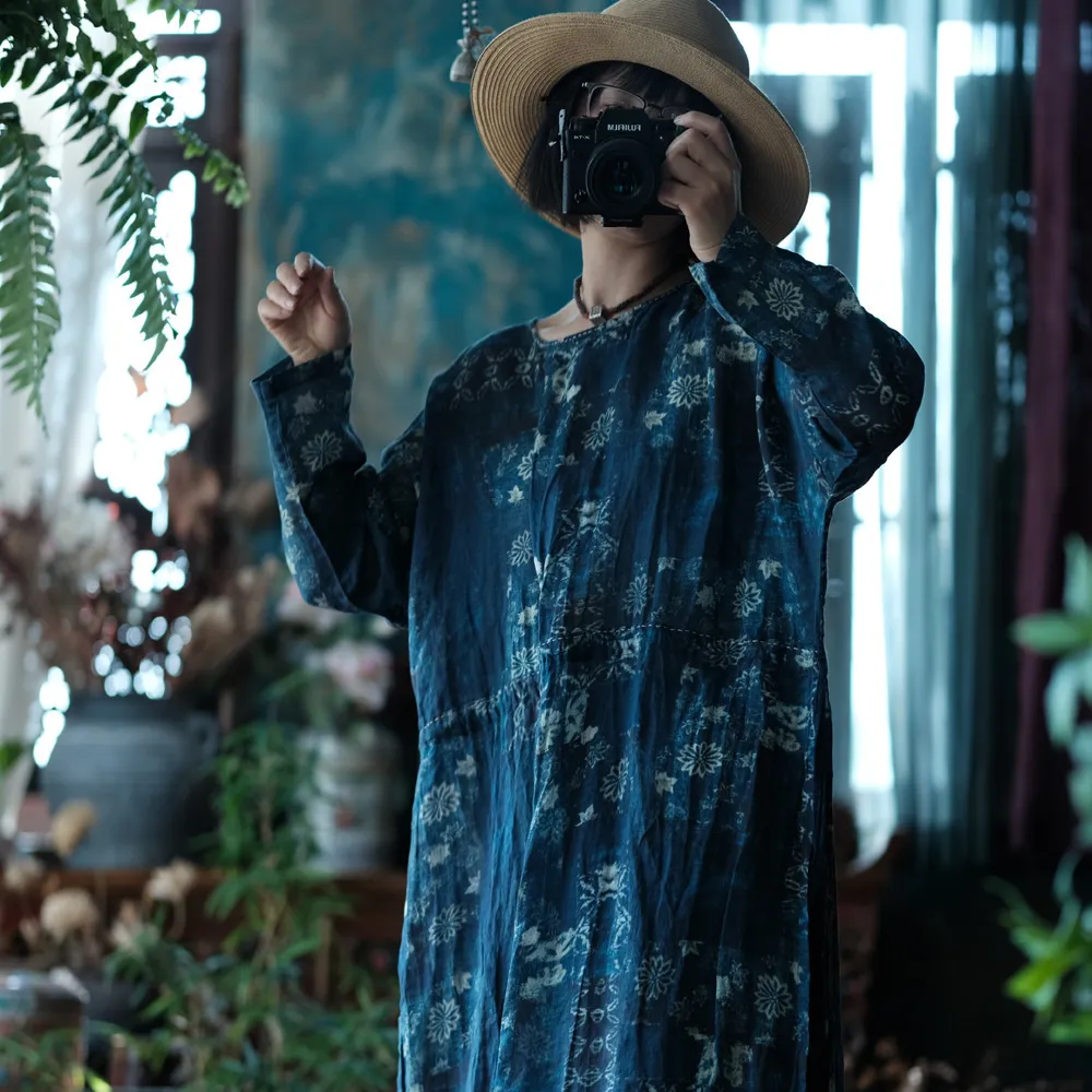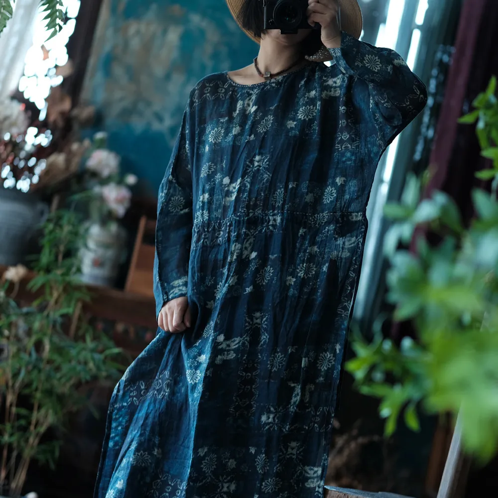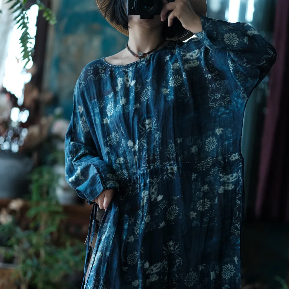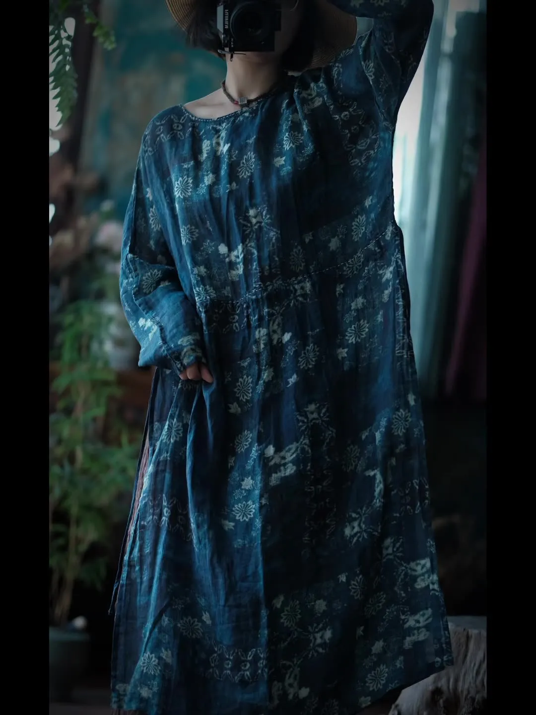 衣都精品- 新款復古文藝苧麻側高叉抽繩連衣裙