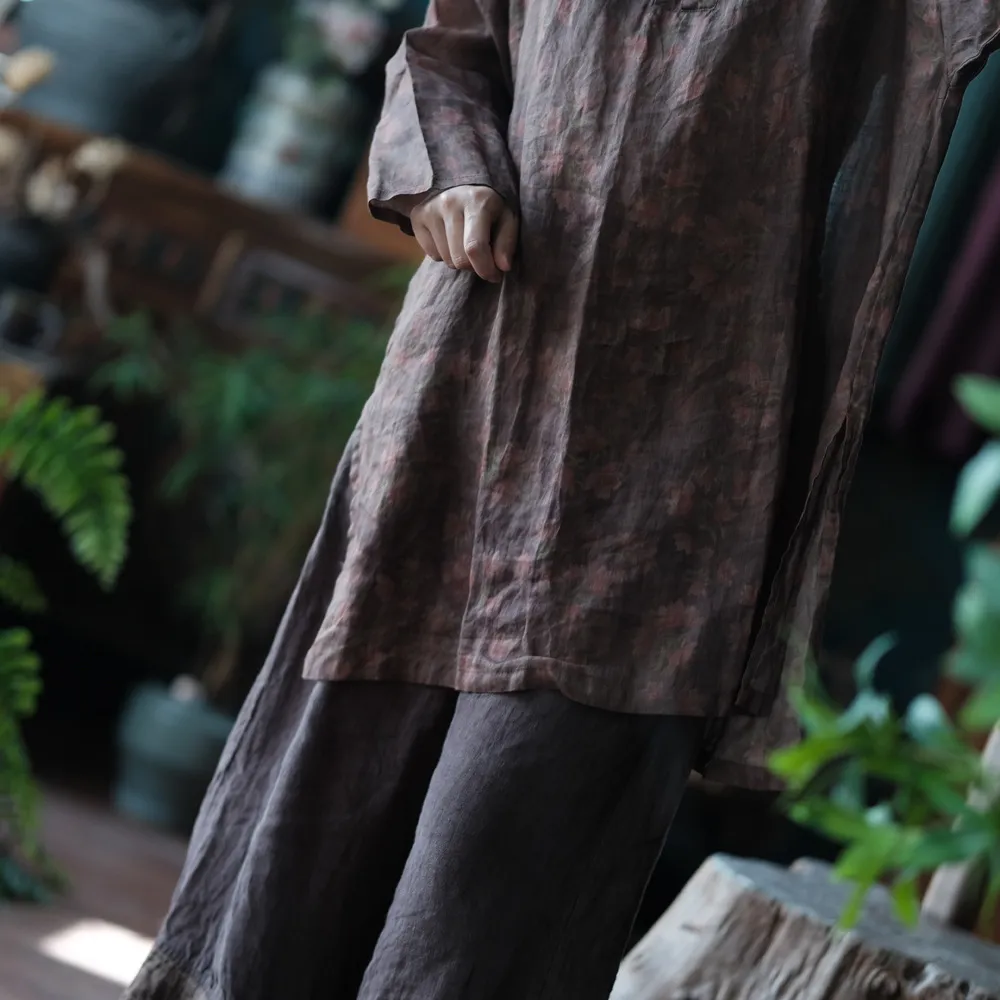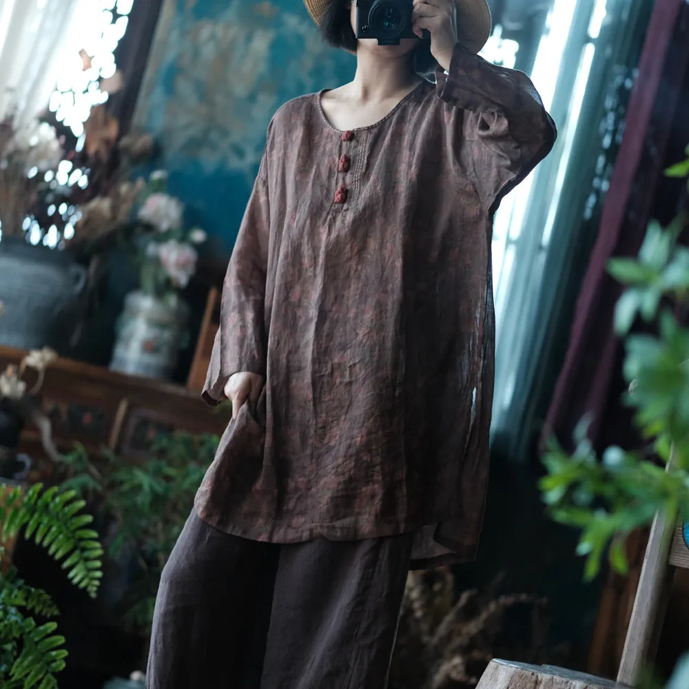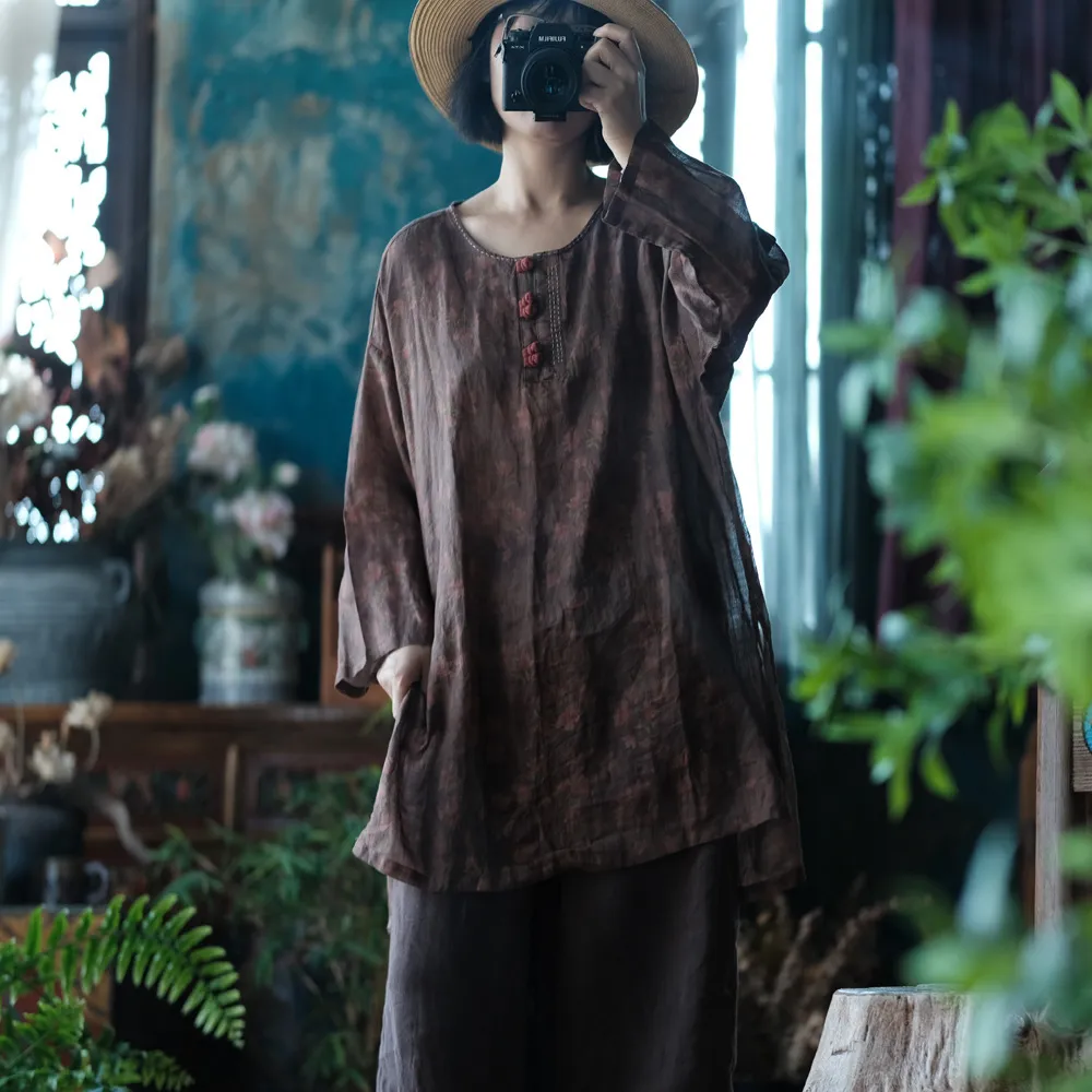 衣都精品- 新款復古苧麻印花寬鬆百搭盤扣毛邊上衣