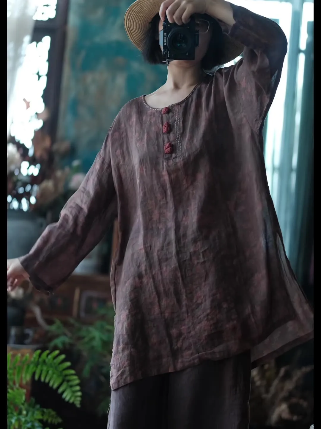 衣都精品- 新款復古做舊苧麻盤扣手工針跡寬鬆上衣