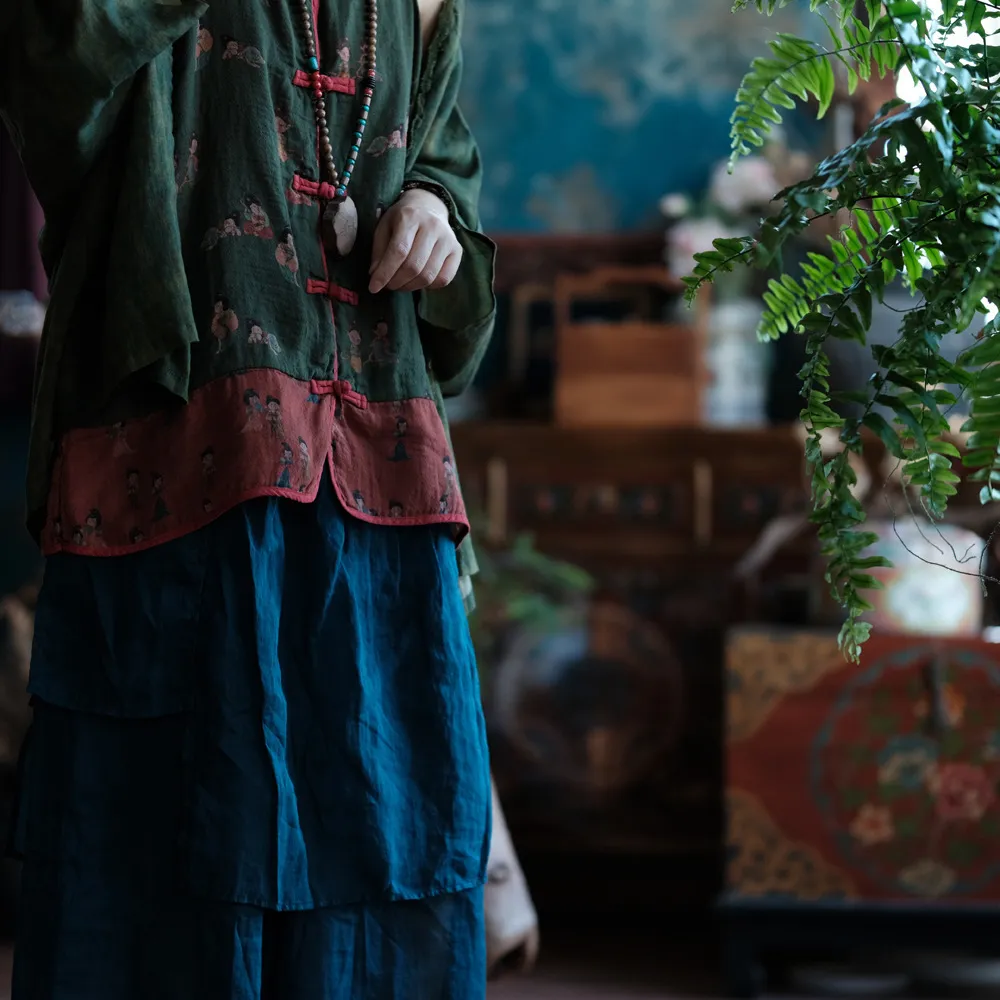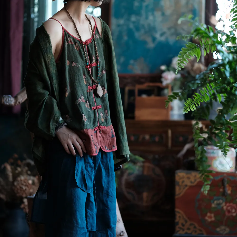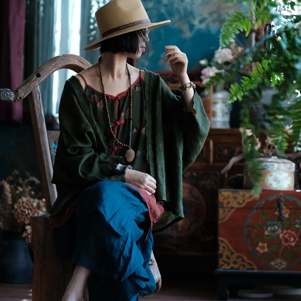 衣都精品- 新款復古做舊苧麻盤扣手工針跡寬鬆上衣