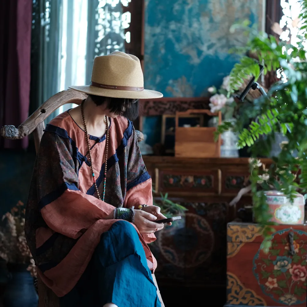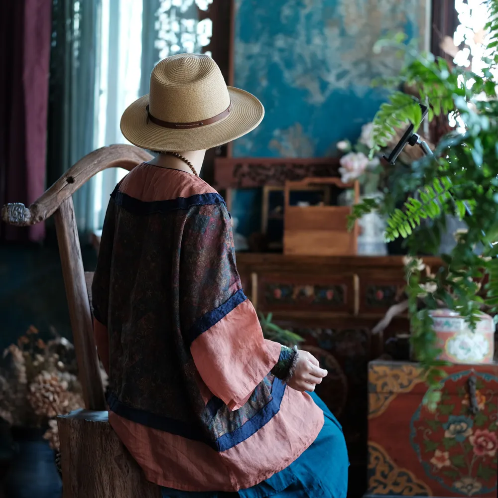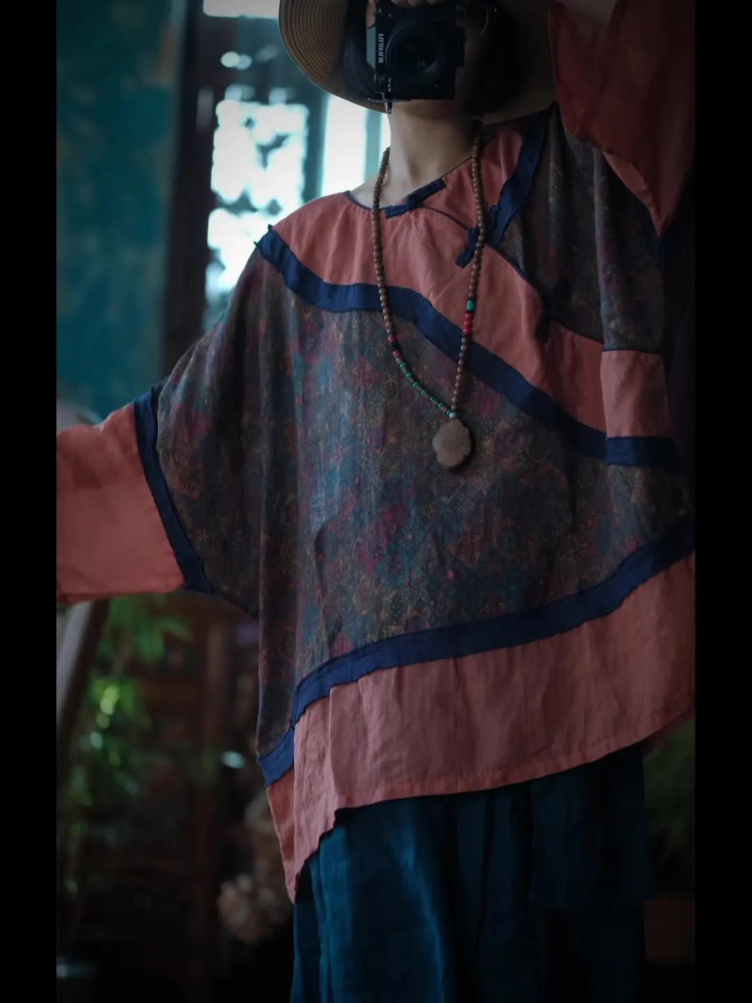 衣都精品- 新款復古做舊苧麻盤扣手工針跡寬鬆上衣