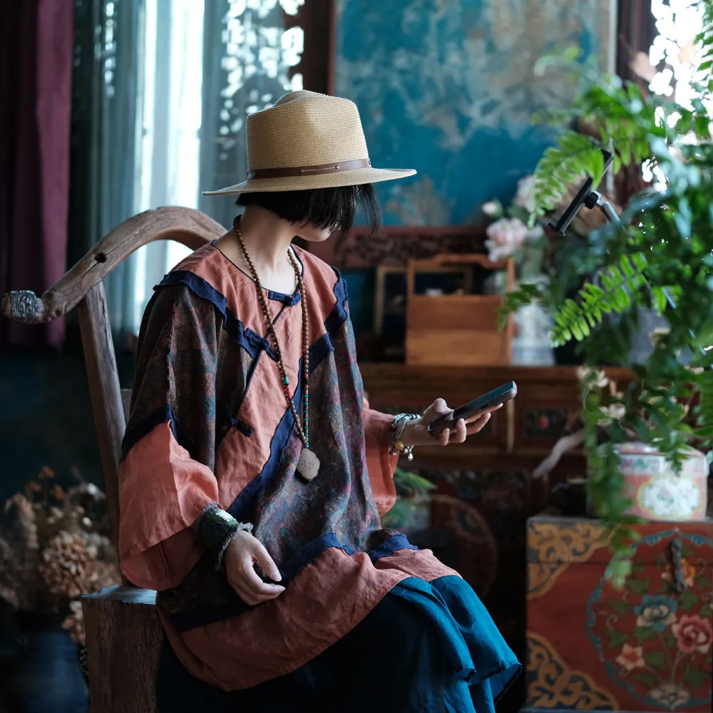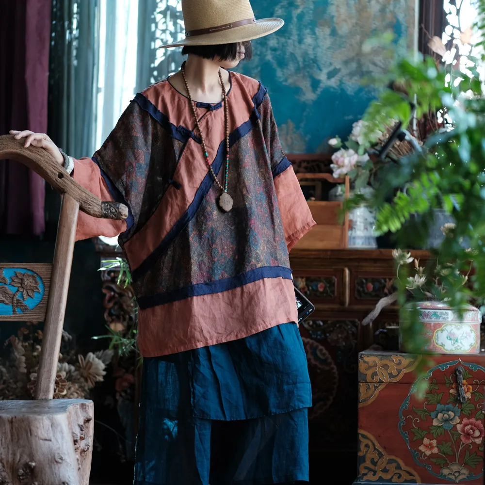 衣都精品- 新款復古純棉圓領斜襟盤扣寬鬆上衣