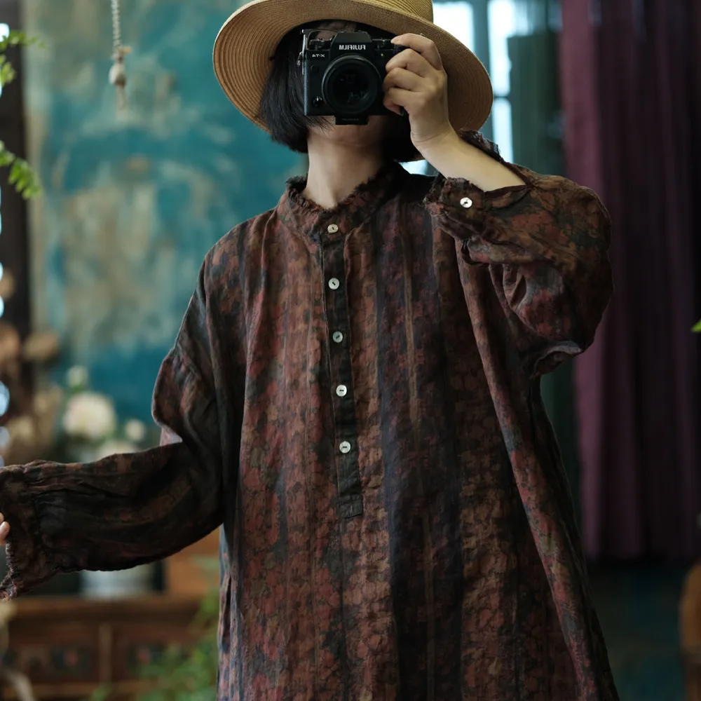 衣都精品- 新款復古文藝數位印花圓領毛邊上衣