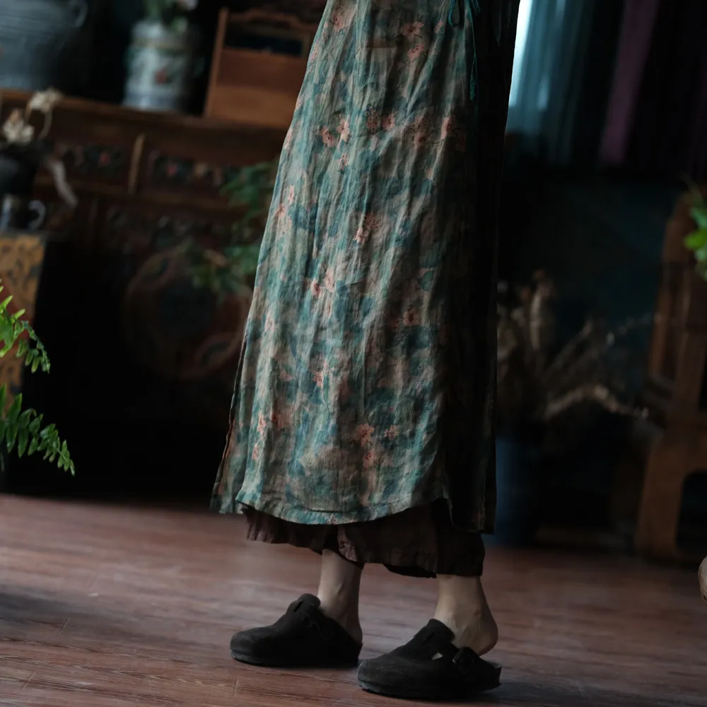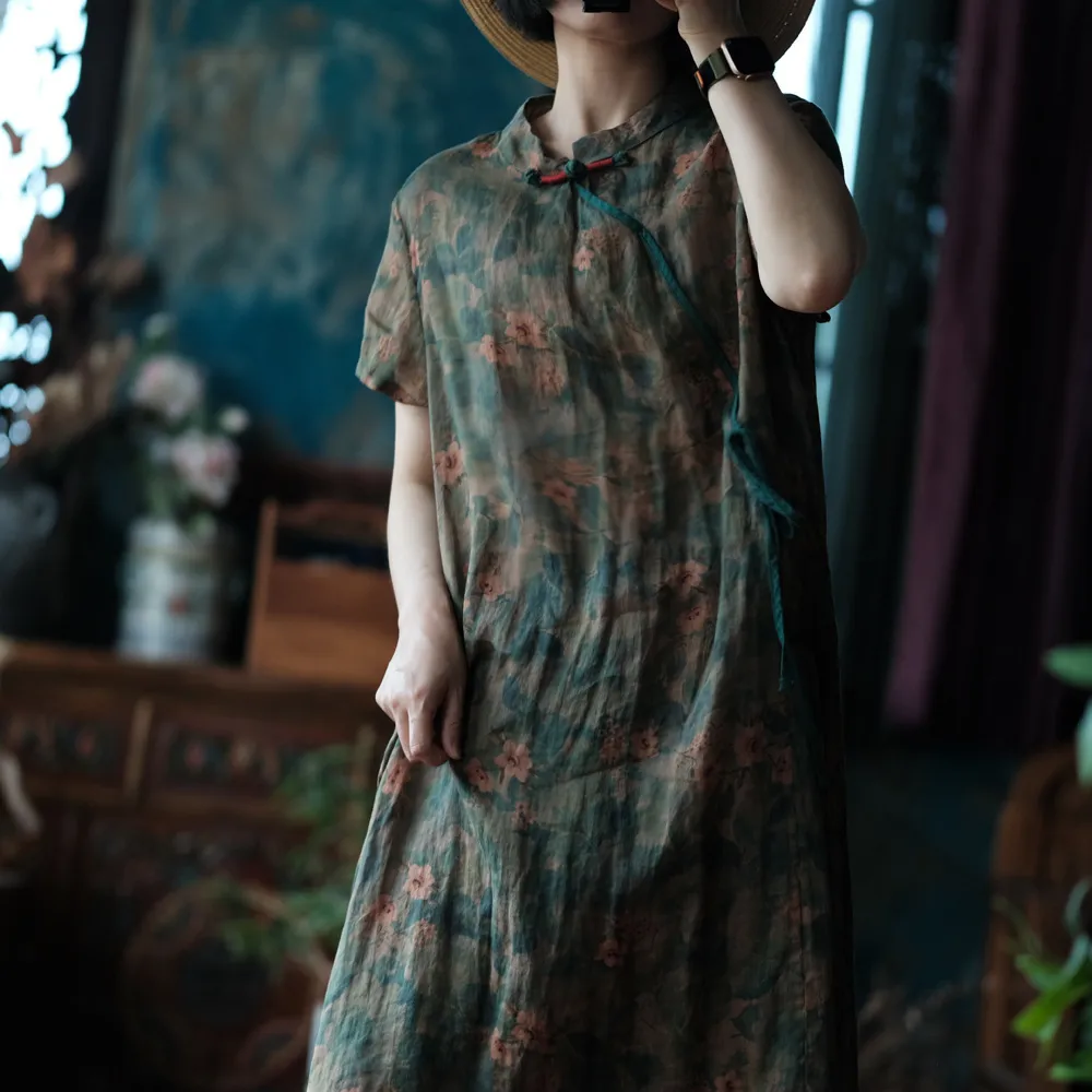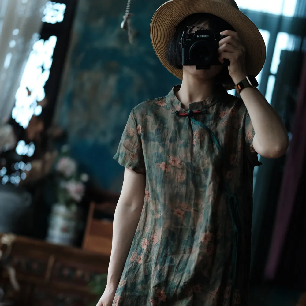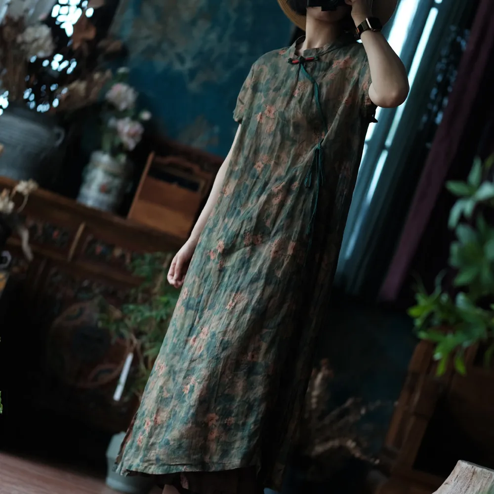 衣都精品- 新款復古水洗數位印花斜襟盤扣連衣裙