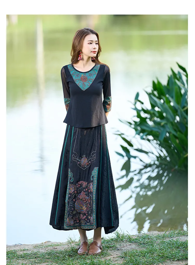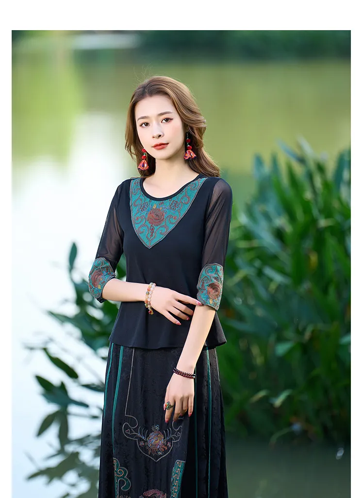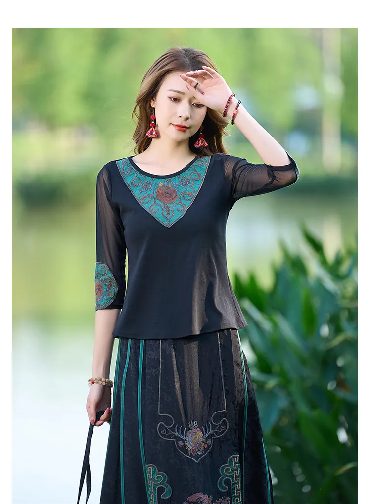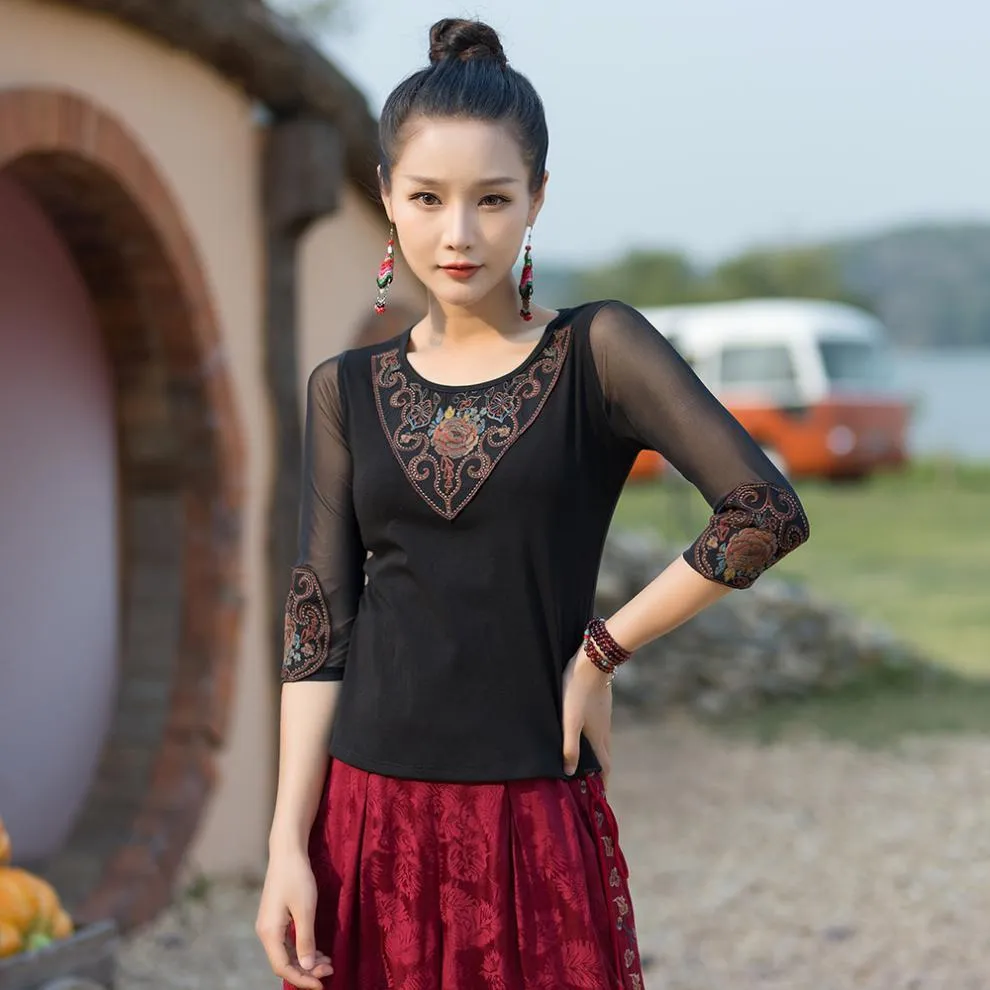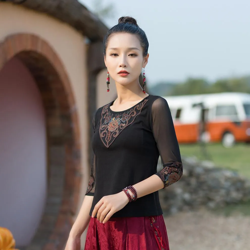 衣都精品- 新款民族風圓領高彈性網紗刺繡上衣