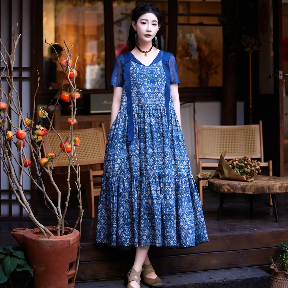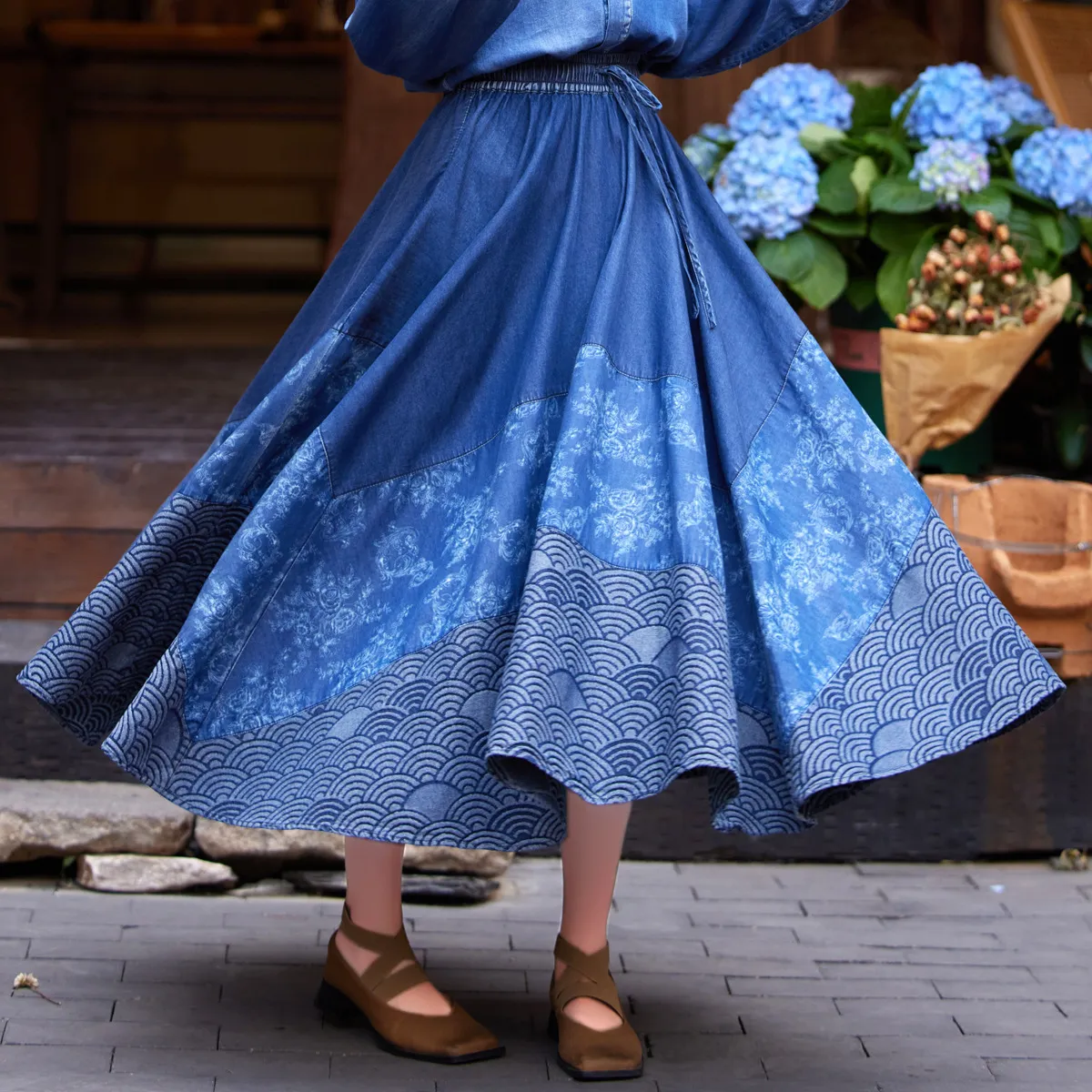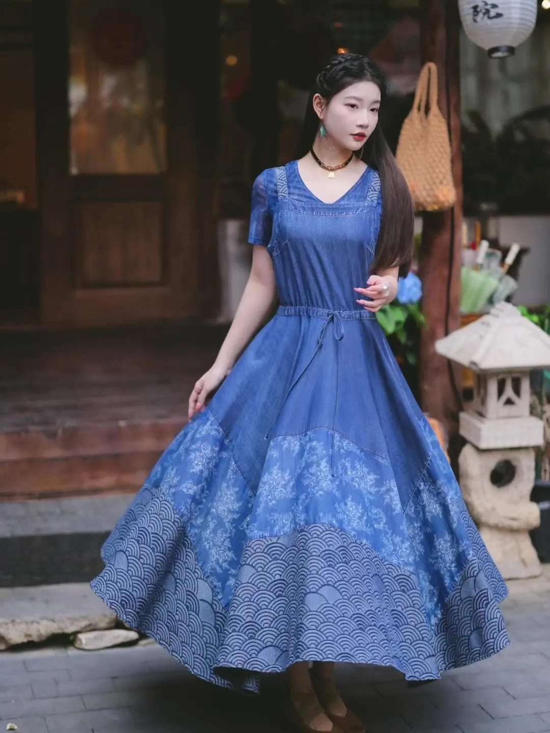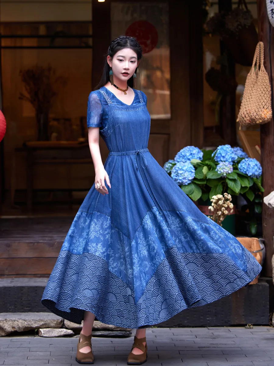 衣都精品- 新款民族風設計牛仔繫帶收腰大擺拼接連衣裙