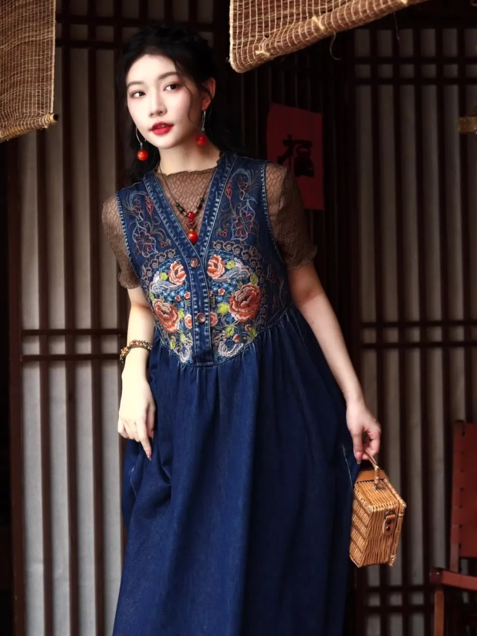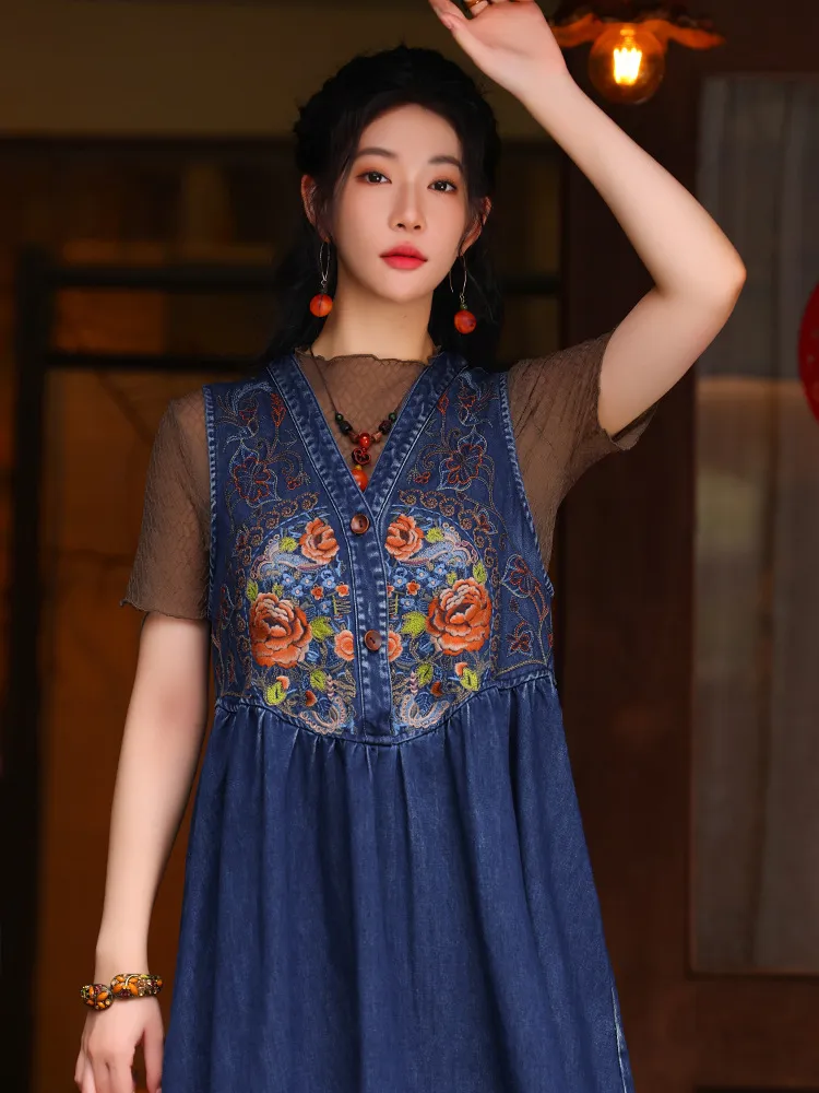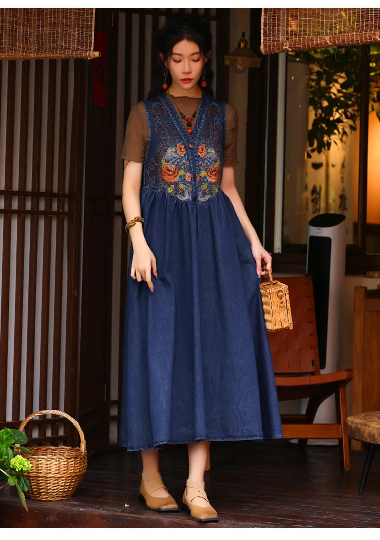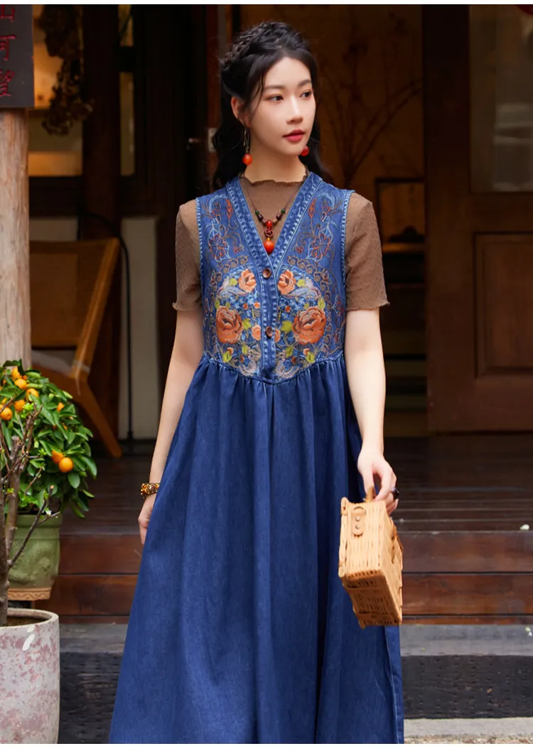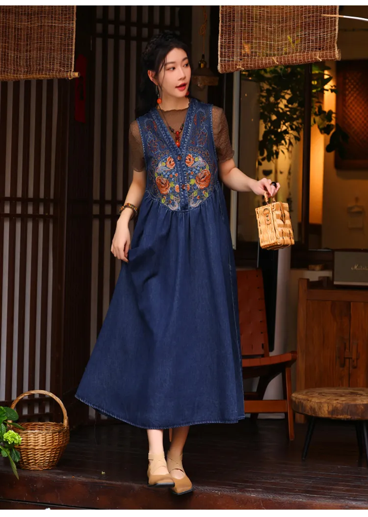 衣都精品- 新款民族風V領刺繡牛仔背心連衣裙