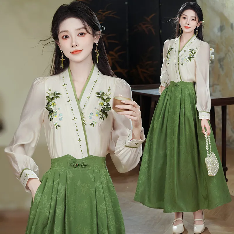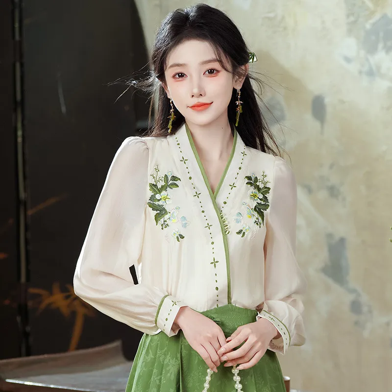 衣都精品- 新款中國風斜襟V領刺繡改良長袖上衣
