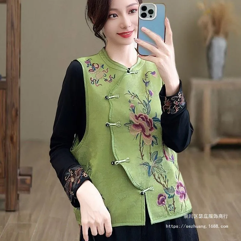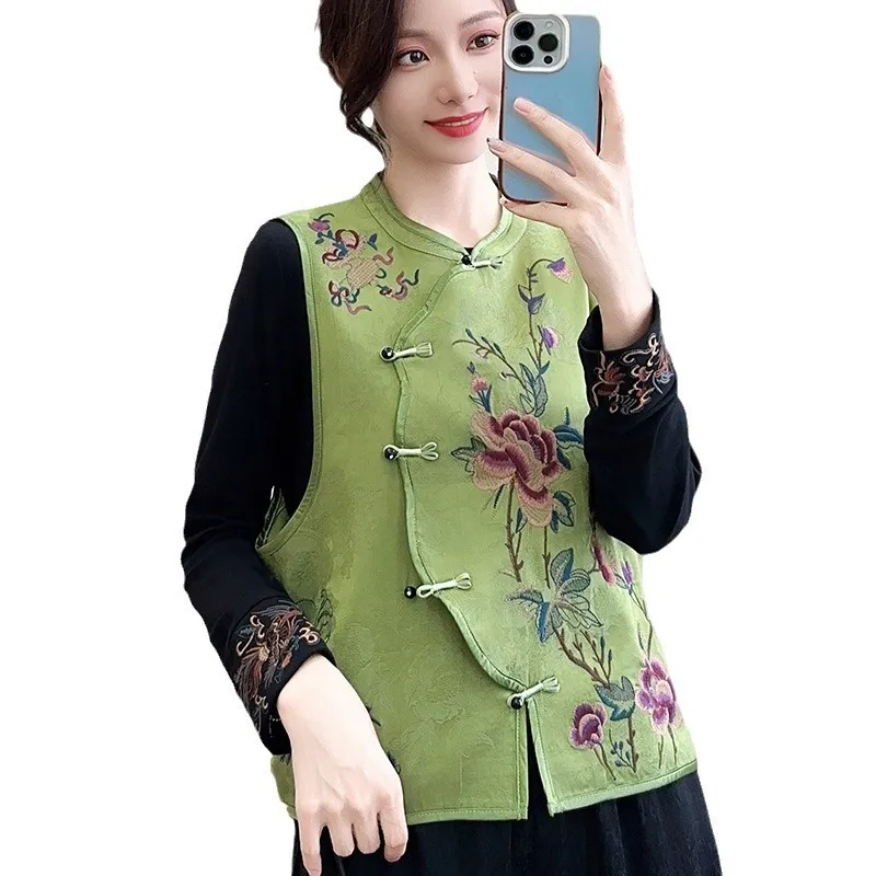 衣都精品- 新款立領套頭無袖刺繡緞面一粒扣馬甲