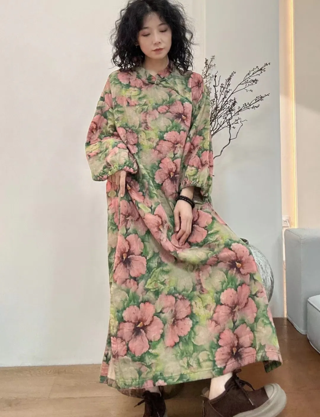 衣都精品- 新款文藝斜紋寬鬆大碼碎花連衣裙