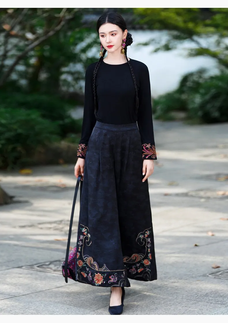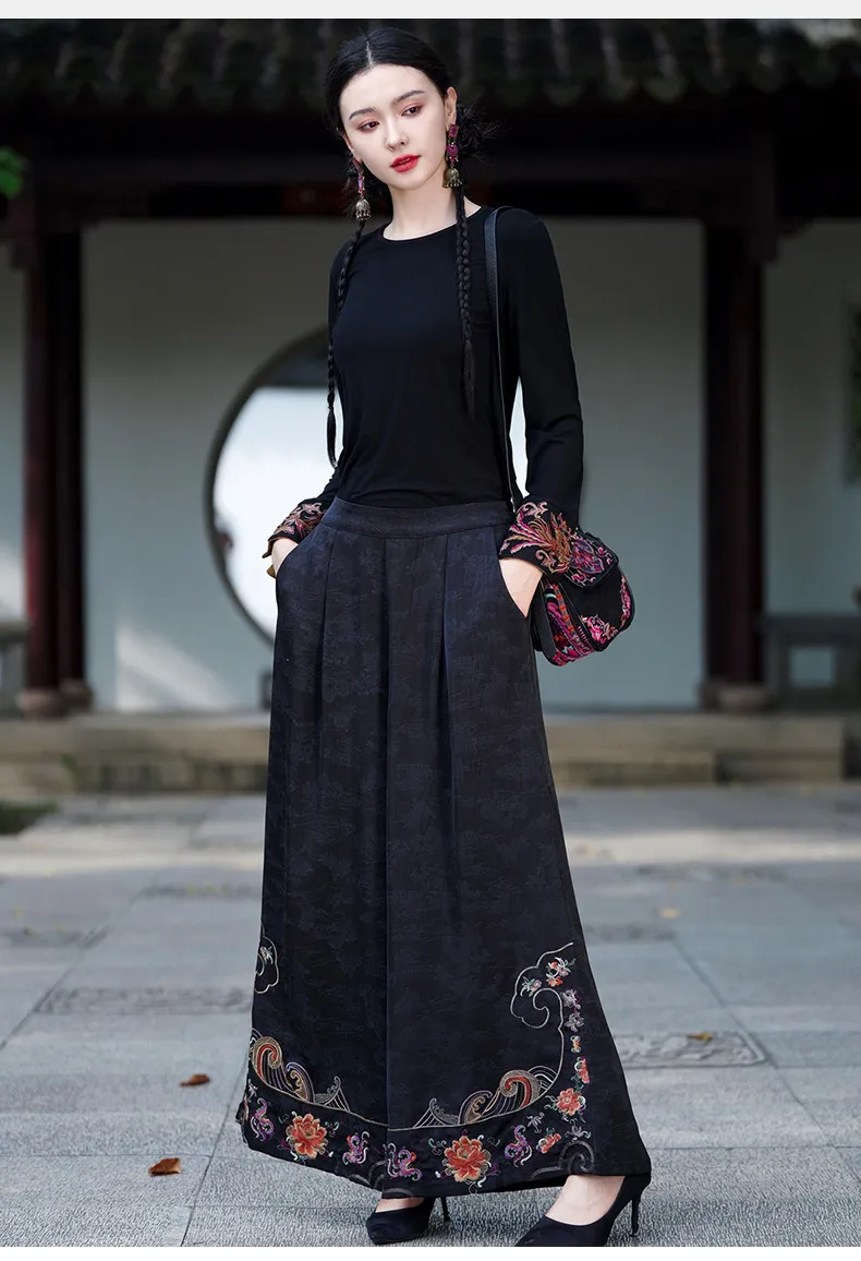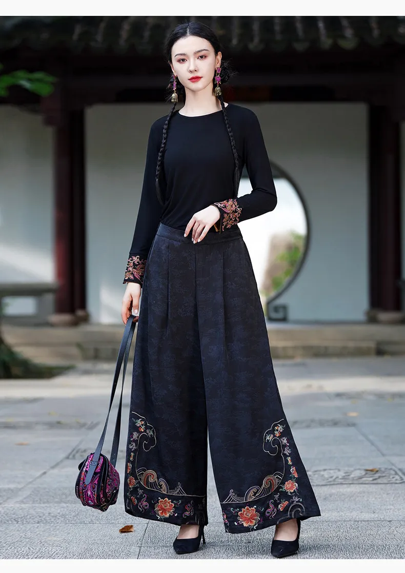 衣都精品- 新款民族風綢面提花寬鬆刺繡闊腿褲