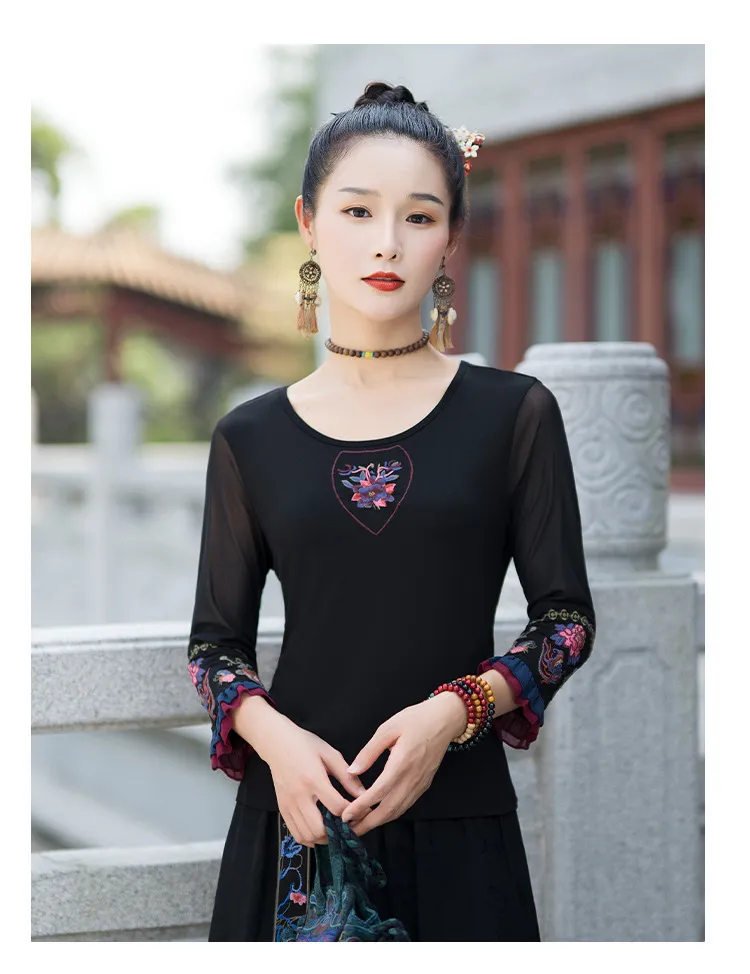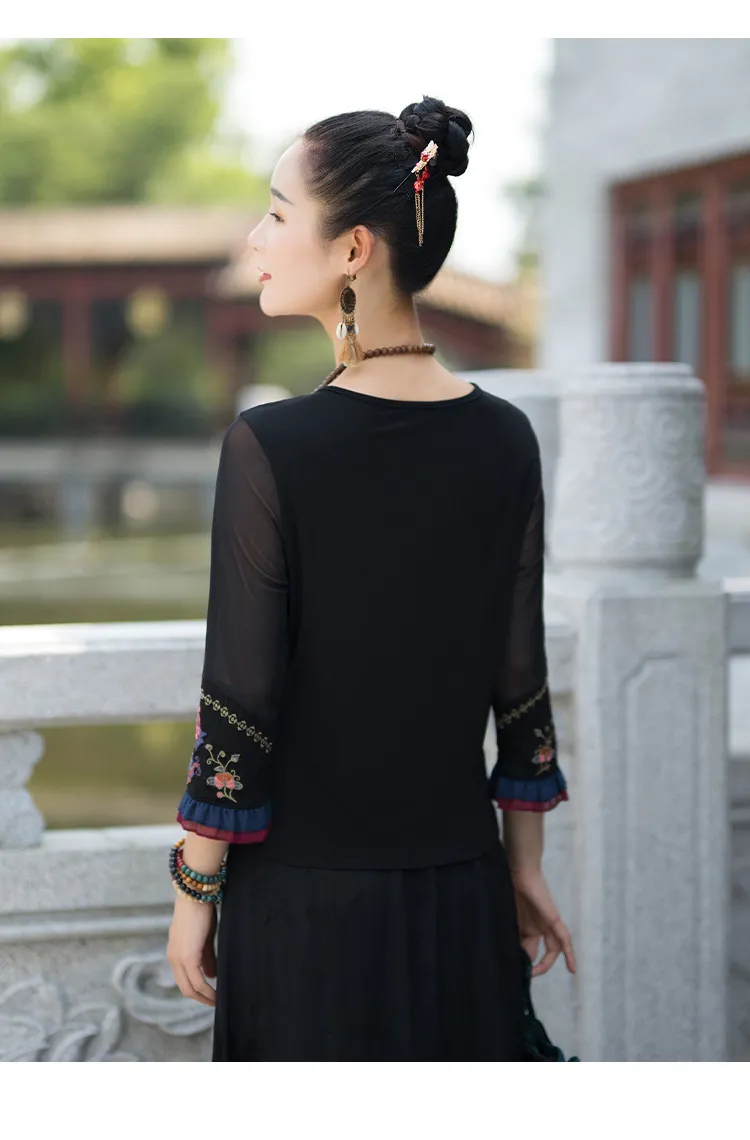 衣都精品- 新款民族風圓領莫代爾網紗袖繡花上衣