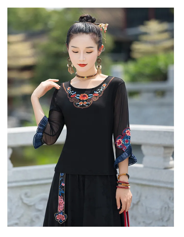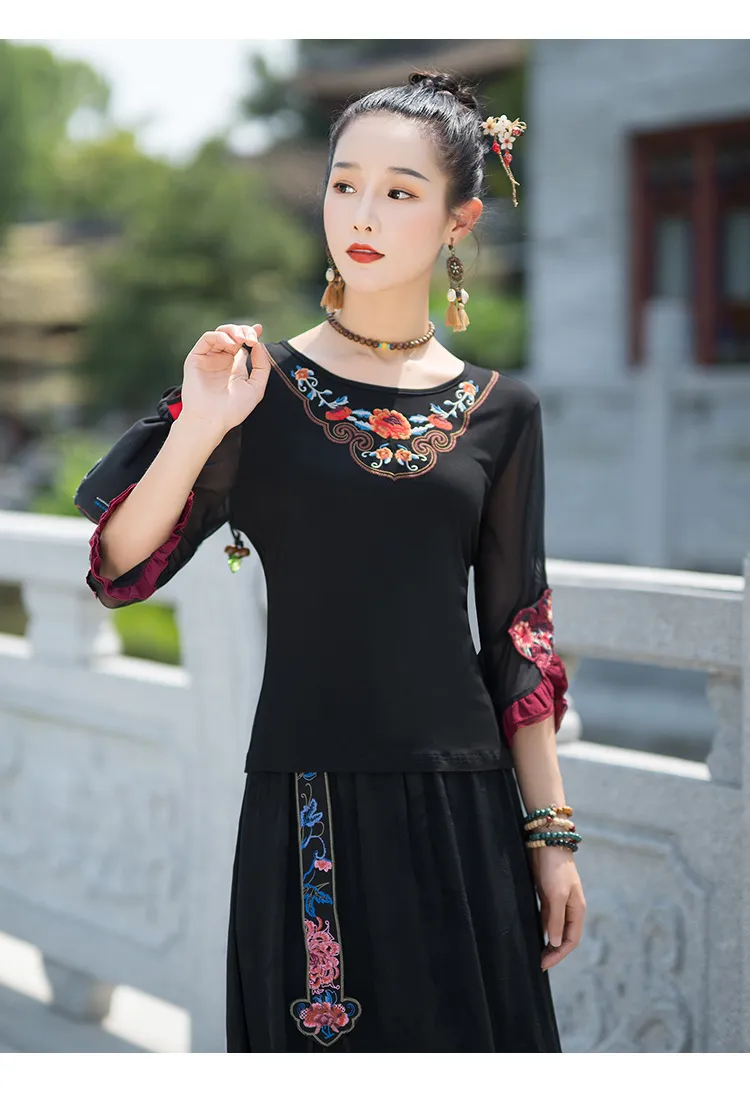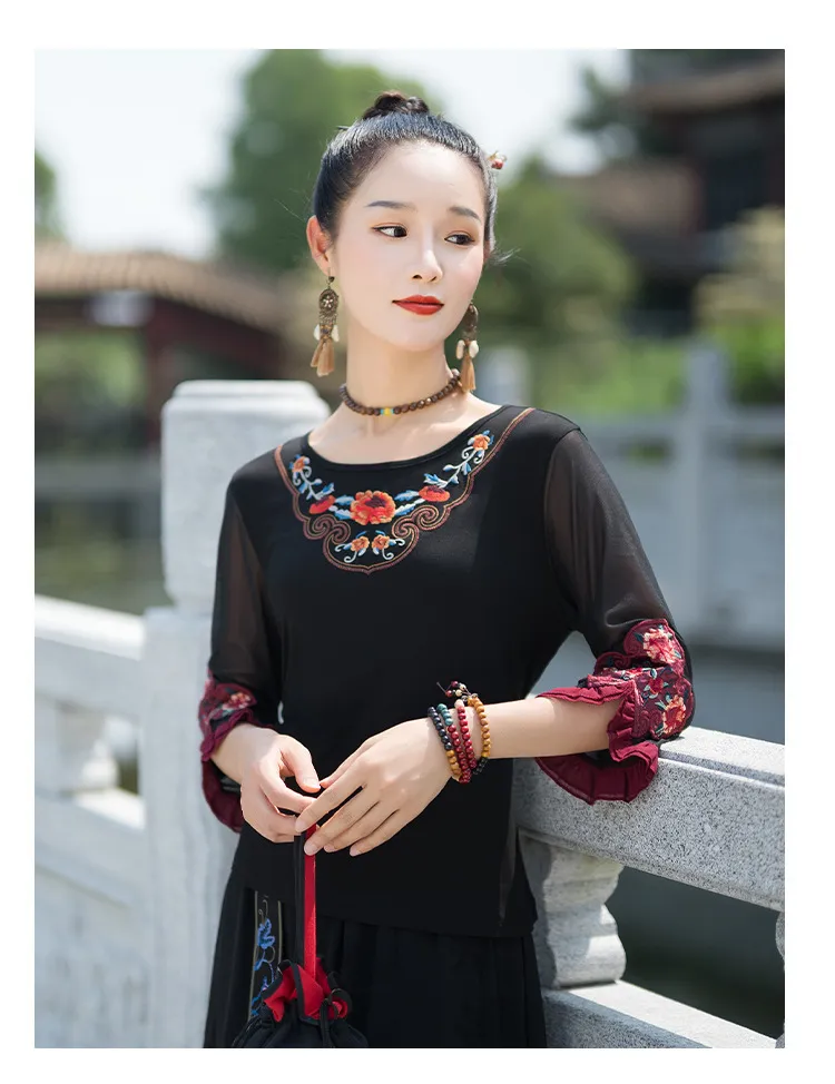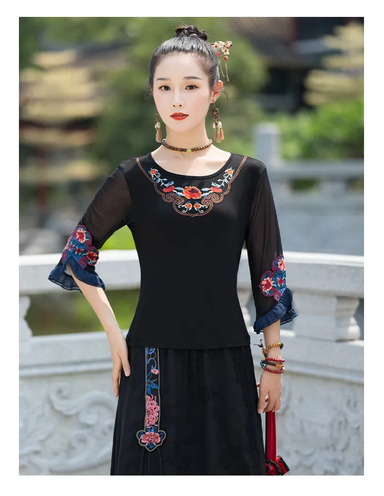 衣都精品- 新款民族風圓領莫代爾網紗袖繡花上衣