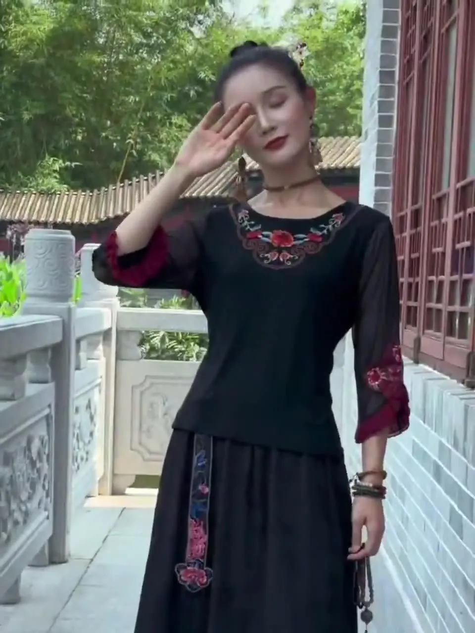 衣都精品- 新款民族風刺繡百搭顯瘦圓領上衣