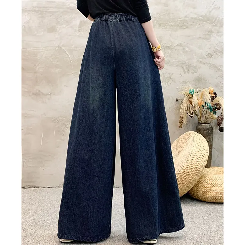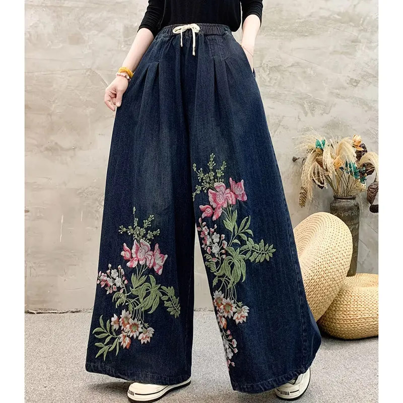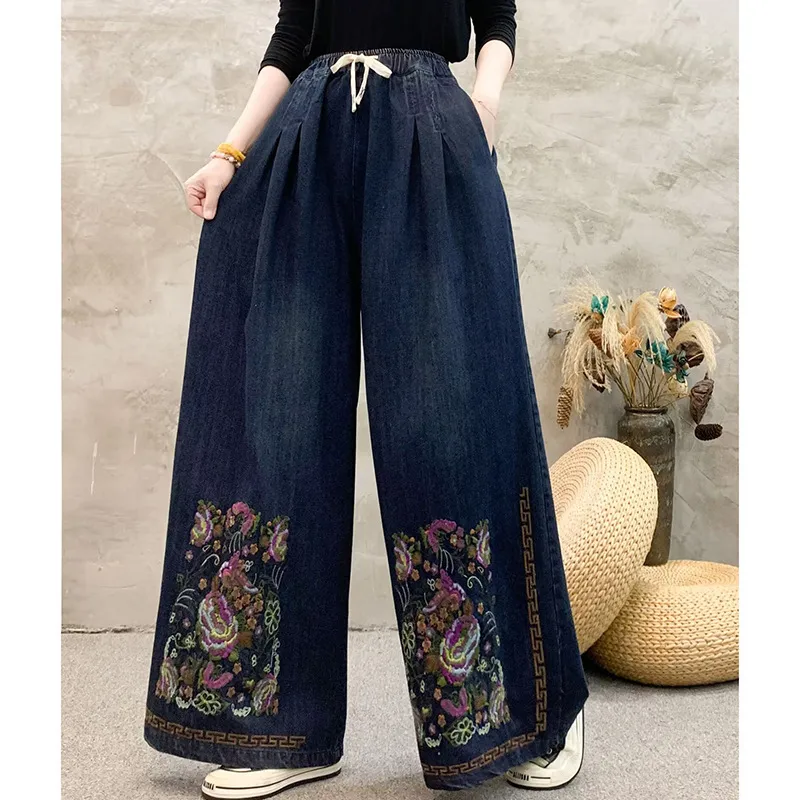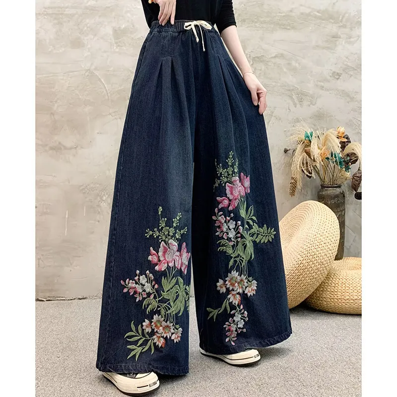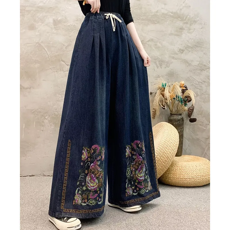 衣都精品- 新款民族風刺繡褶皺繫帶寬鬆牛仔褲