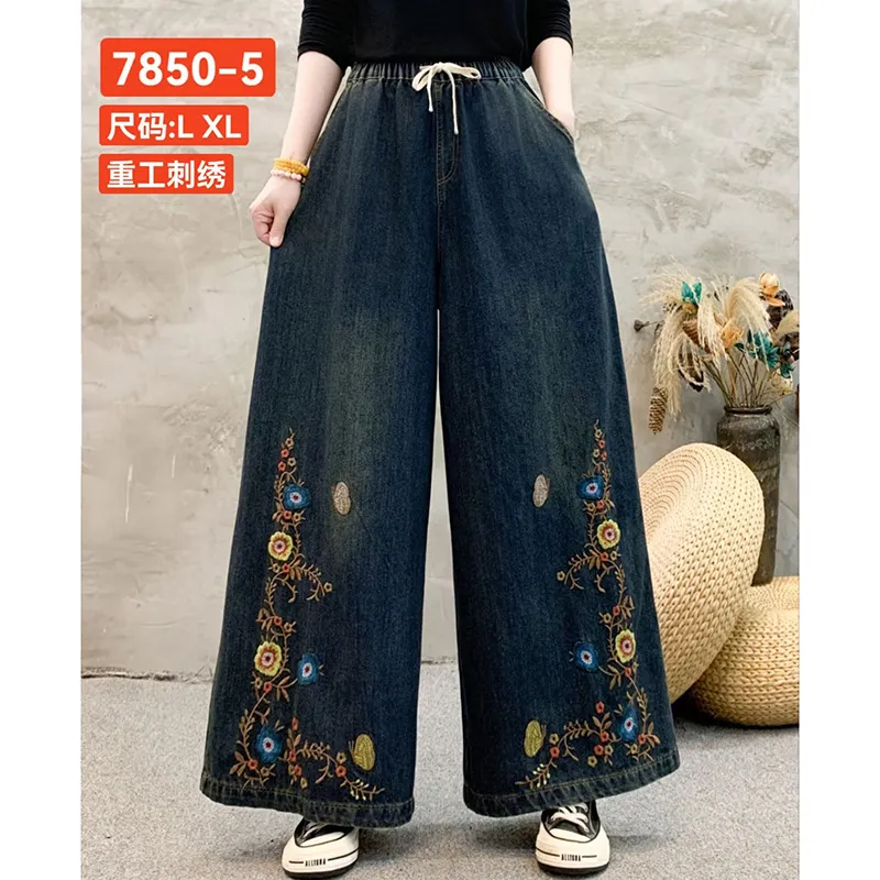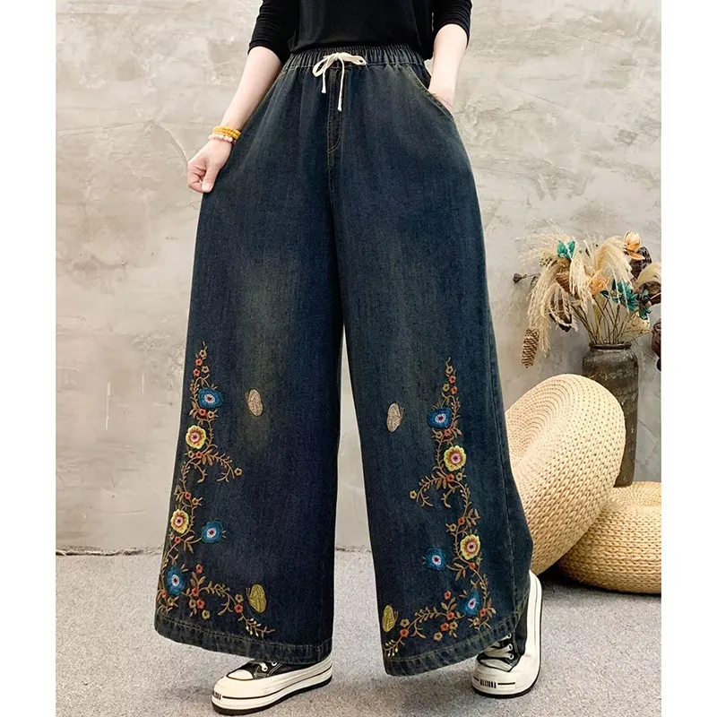 衣都精品- 新款民族風刺繡褶皺繫帶寬鬆牛仔褲