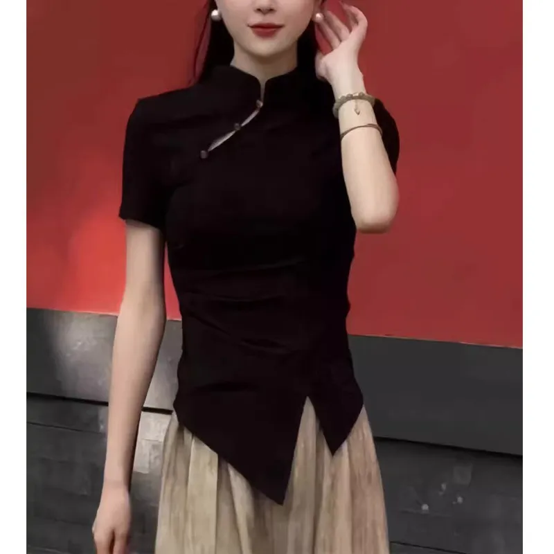 衣都精品- 新款中式立領鏤空短袖不規則提花上衣