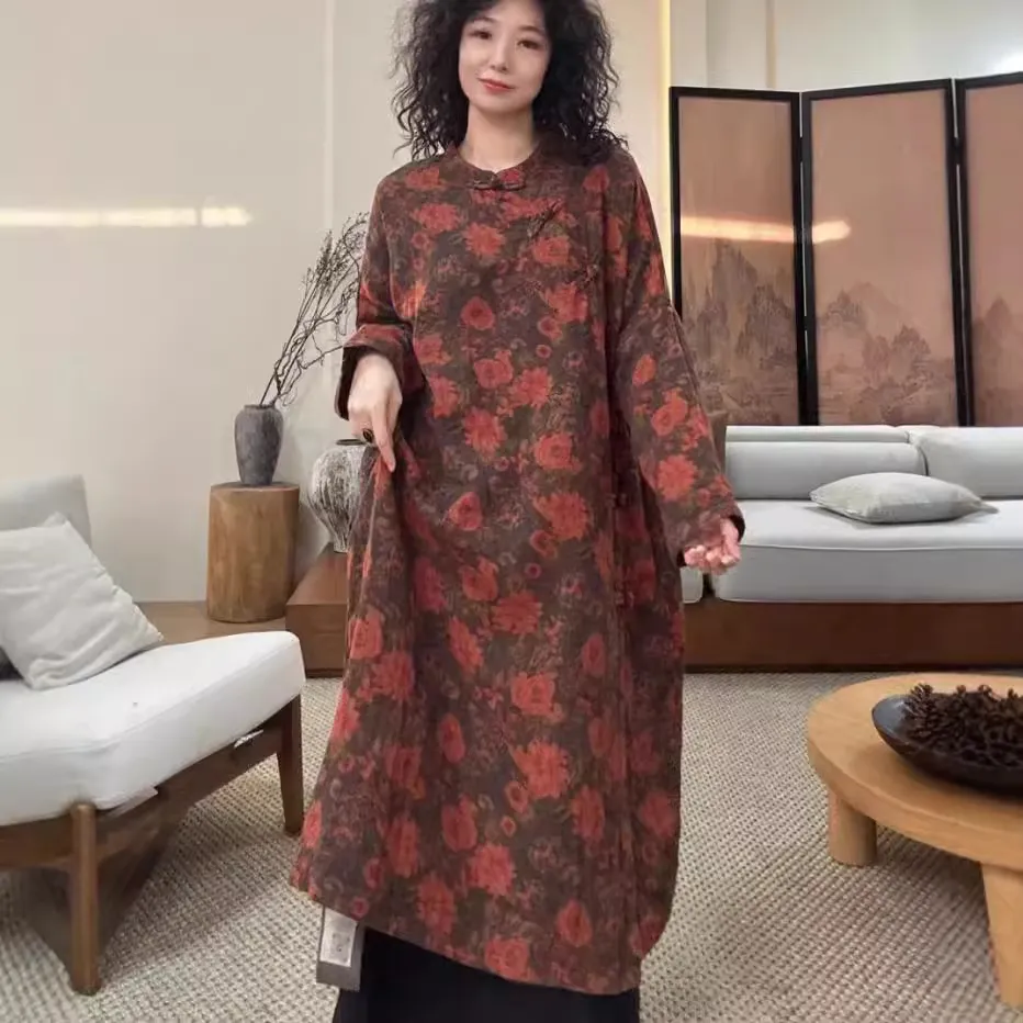 衣都精品- 新款寬鬆大碼碎花印花盤扣連衣裙