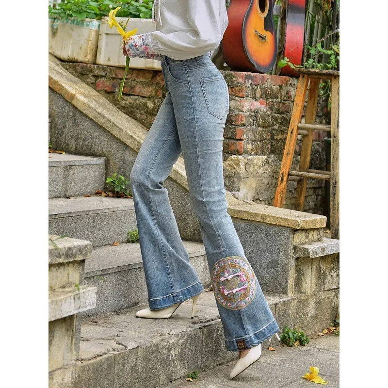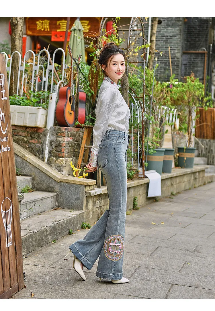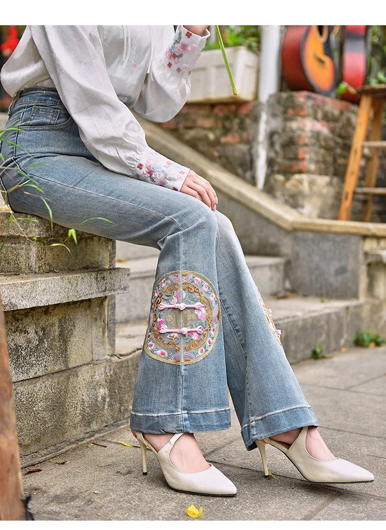 衣都精品- 新款中國風重工刺繡修身高腰牛仔褲