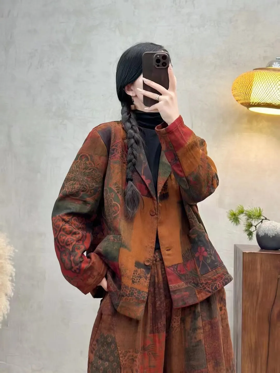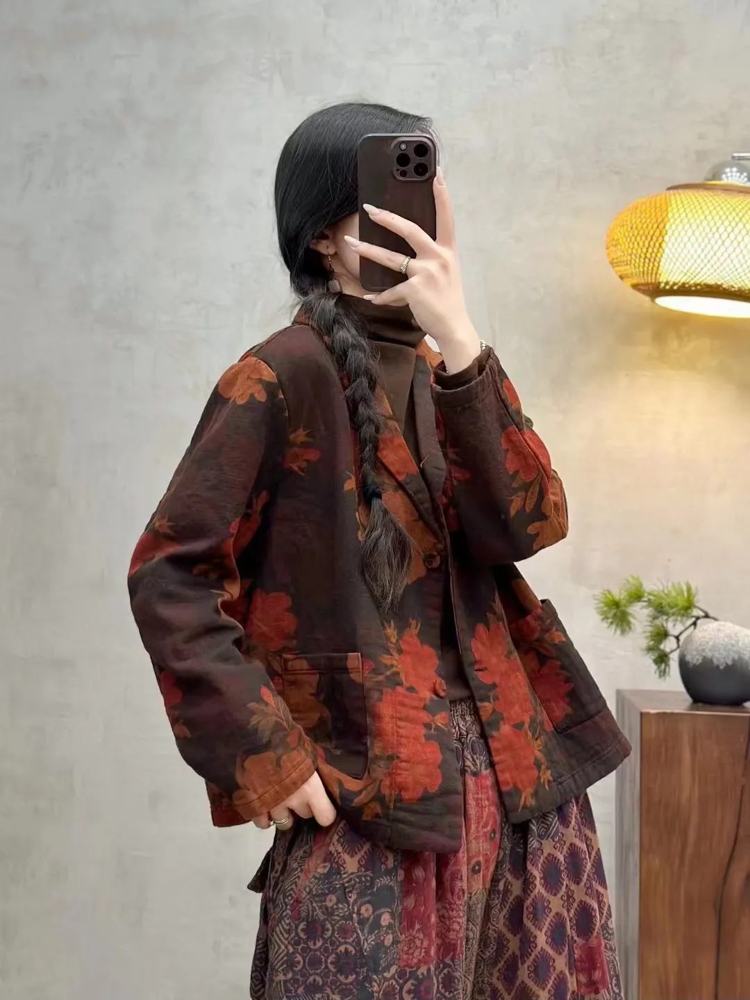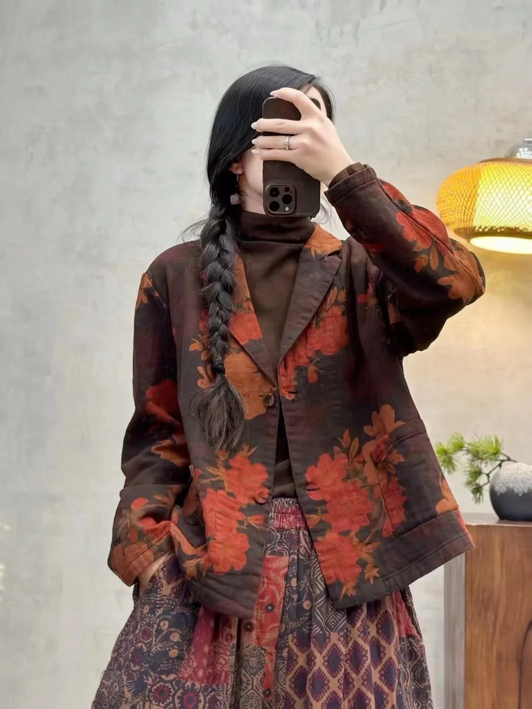衣都精品- 新款復古數碼印花西裝領盤扣外套