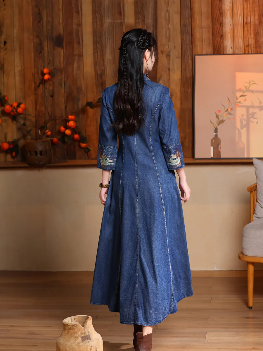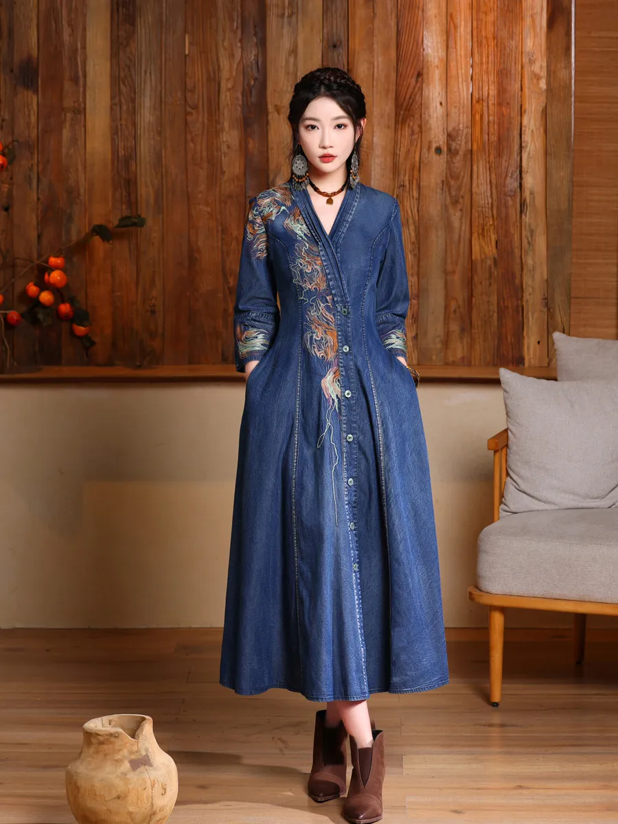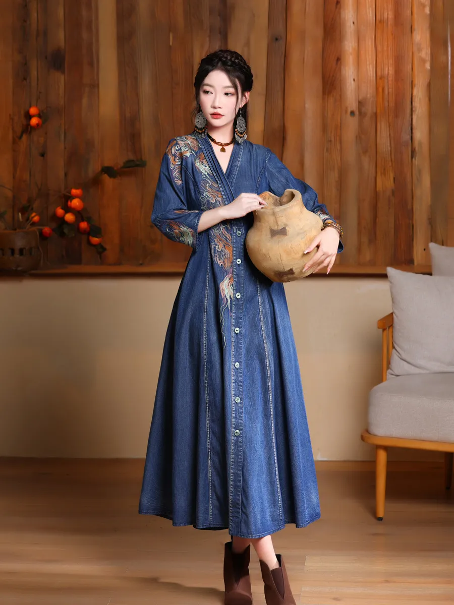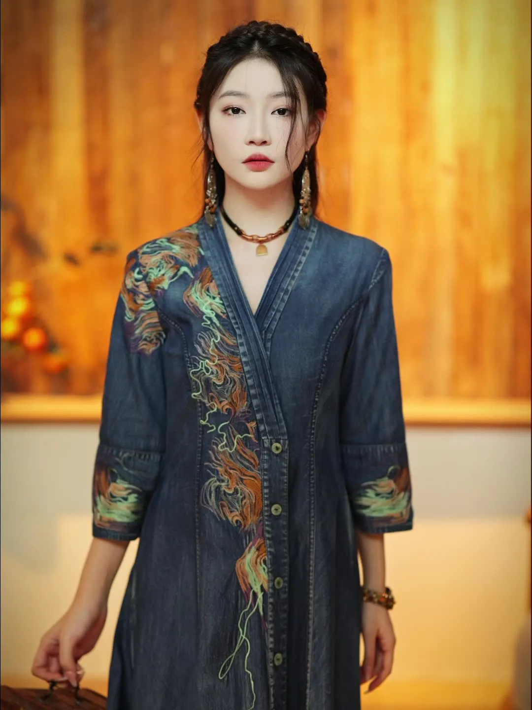 衣都精品- 新款復古民族風重工刺繡牛仔連衣裙