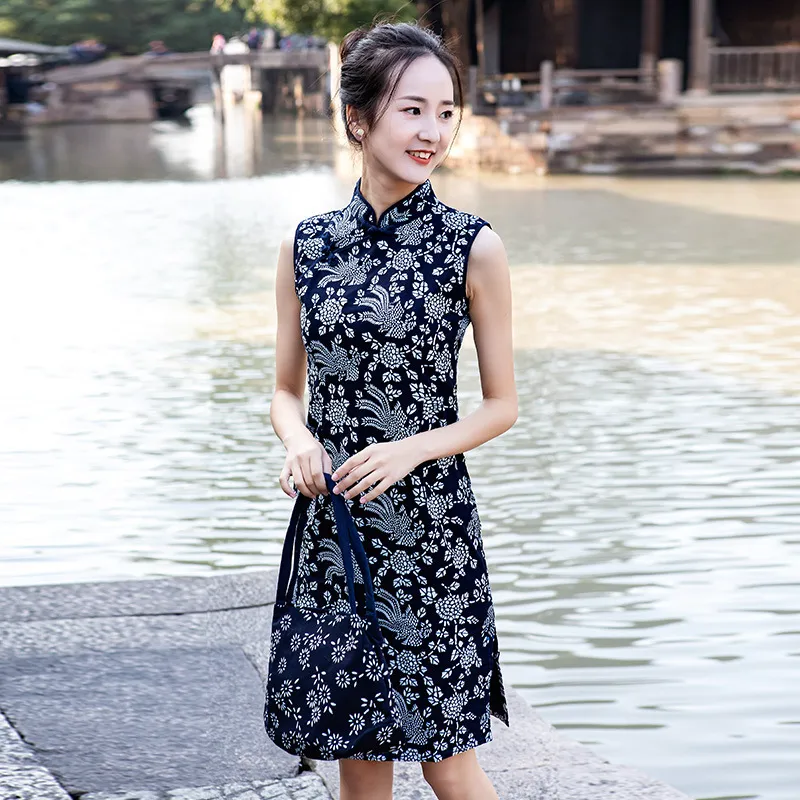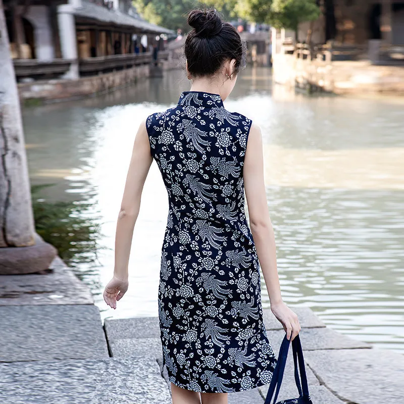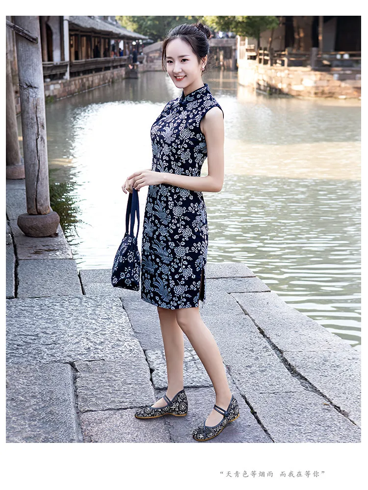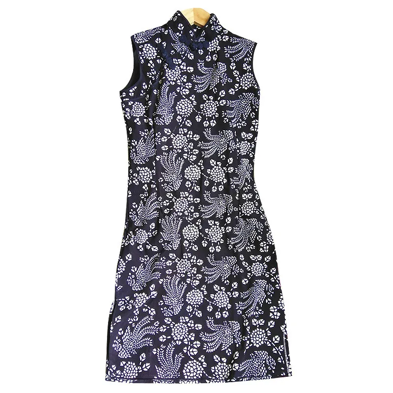 衣都精品- 新款手工藍印花布復古斜襟旗袍無袖顯瘦連衣裙
