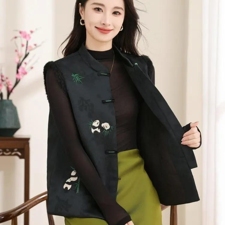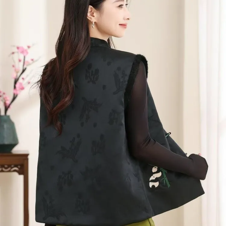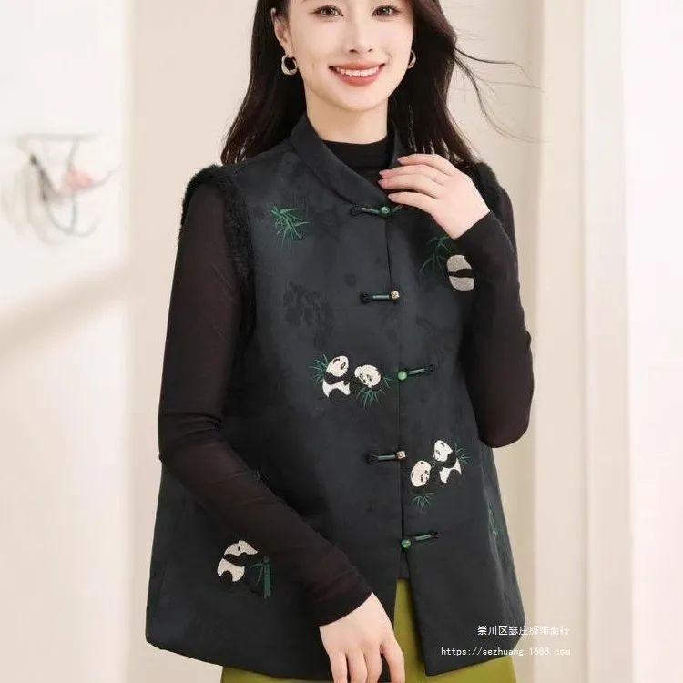衣都精品- 新款中國風熊貓刺繡夾棉馬甲盤扣外套