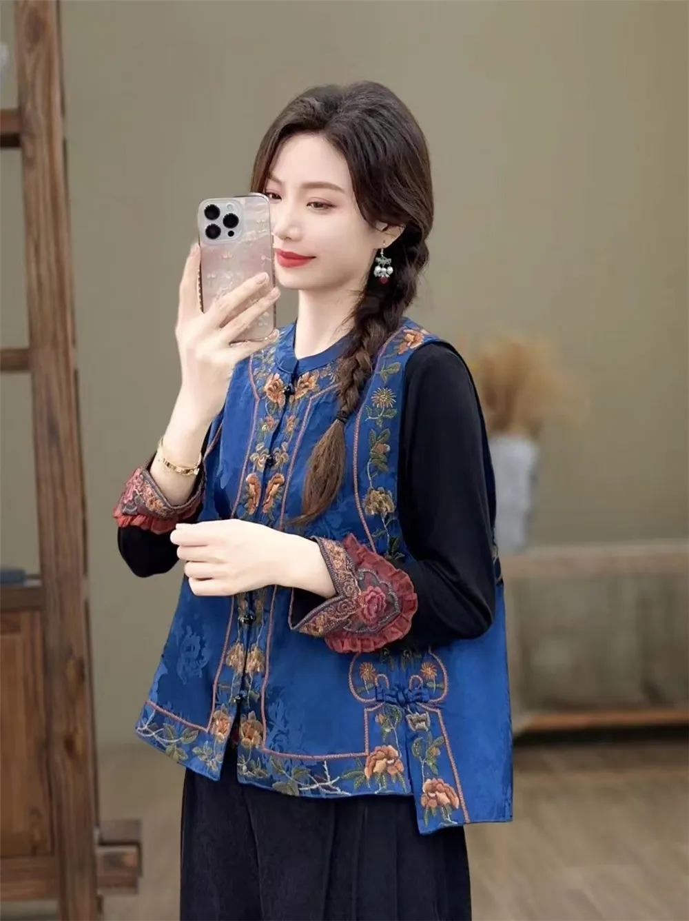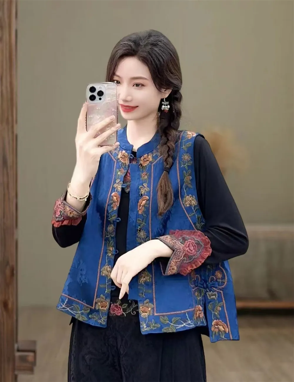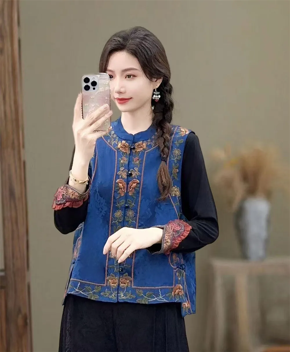 衣都精品- 新款中國風緞面提花重工刺繡珠扣馬甲