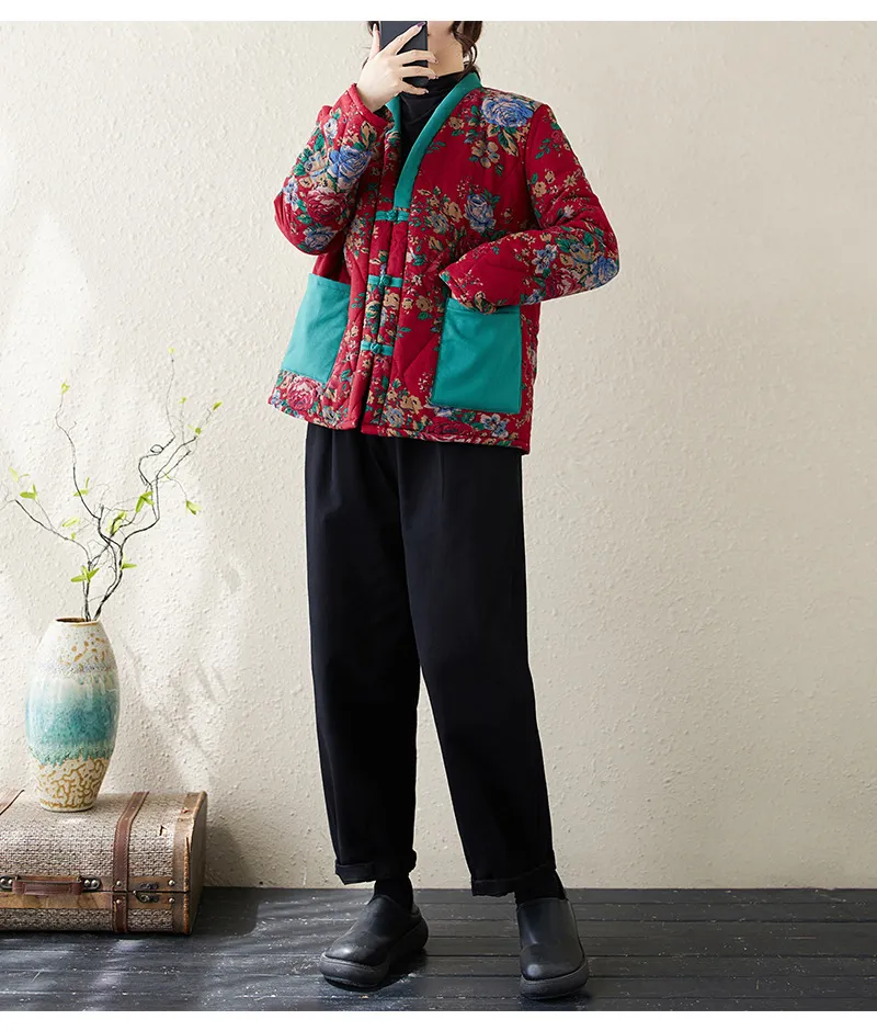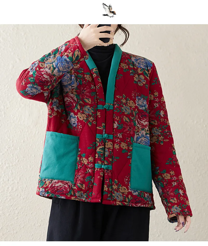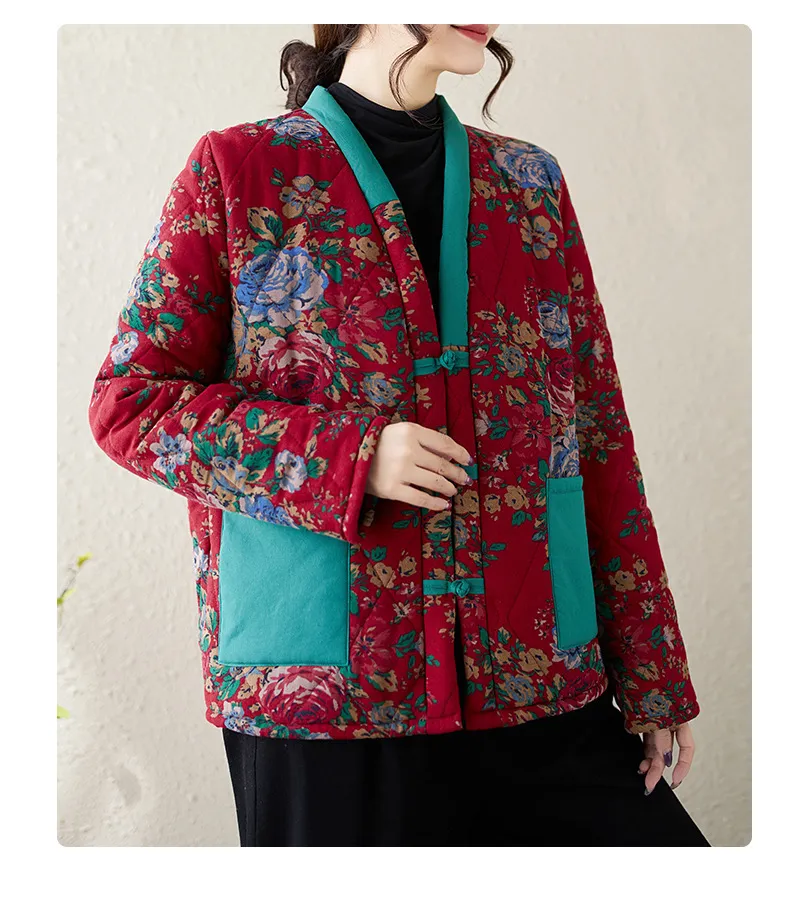 衣都精品- 新款民族風大碼V領盤扣印花保暖外套
