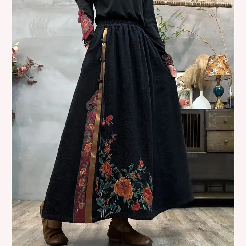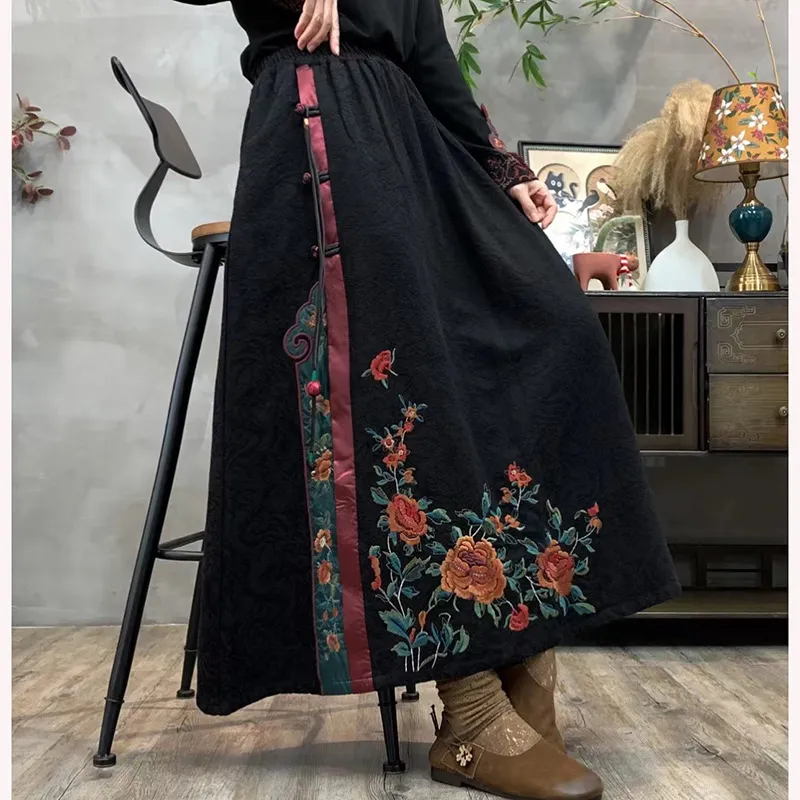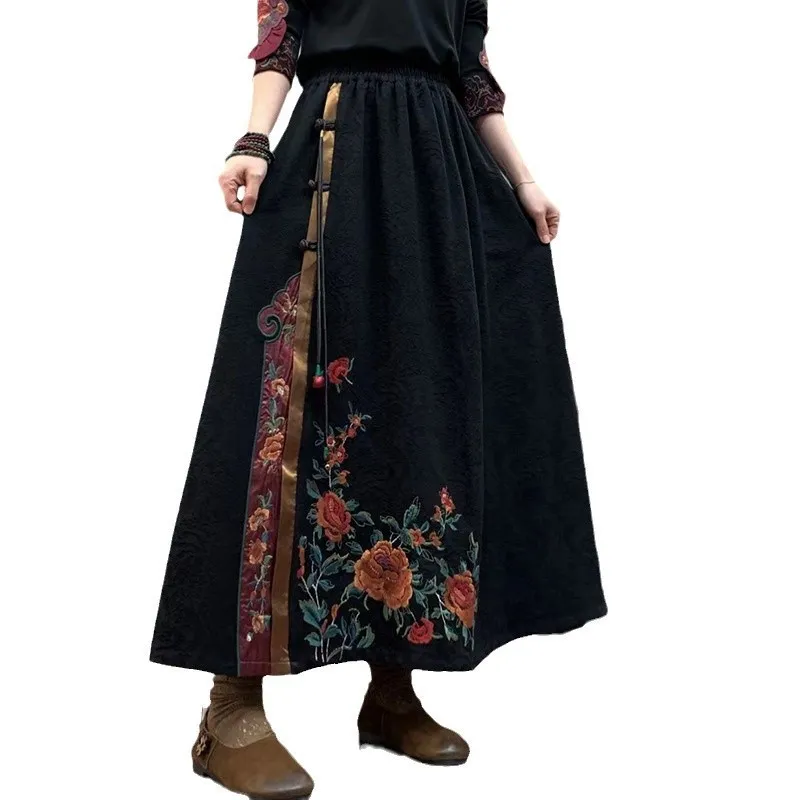 衣都精品- 新款民族風刺繡鬆緊腰大碼顯瘦撞色半身裙