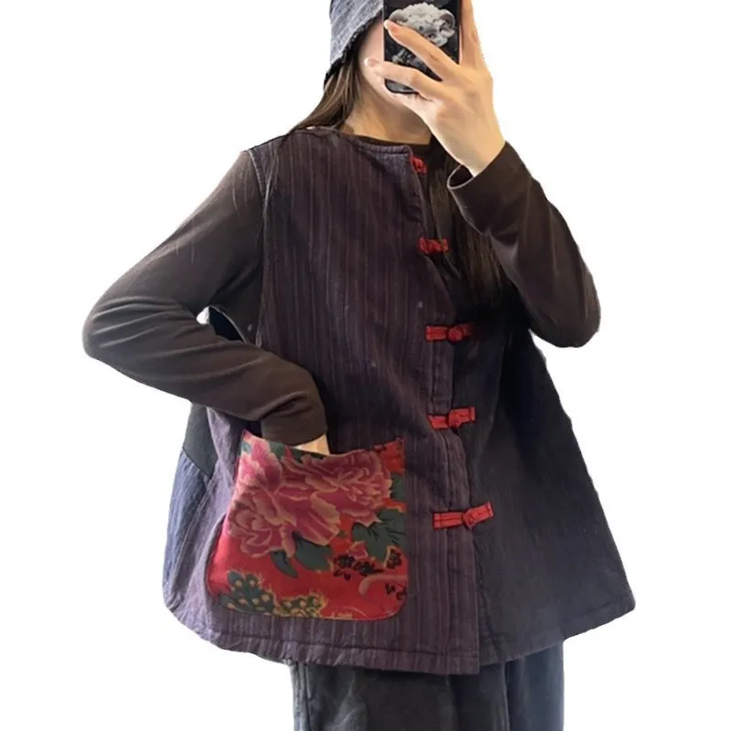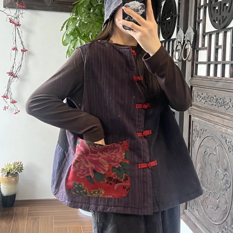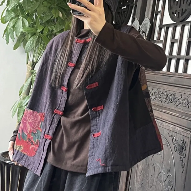 衣都精品- 新款做舊圓領拼接復古盤扣貼布馬甲外套