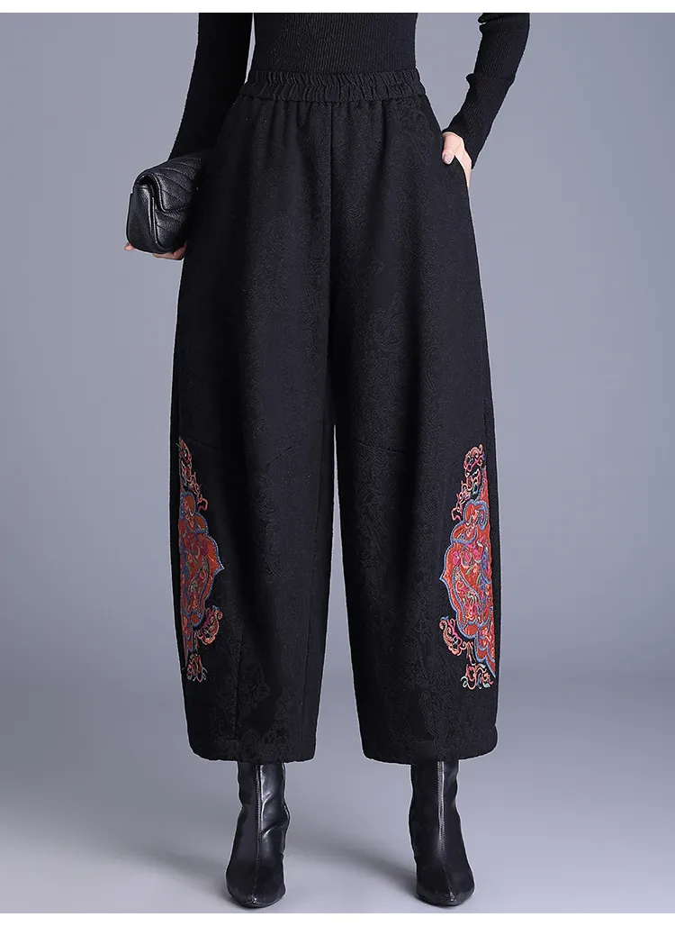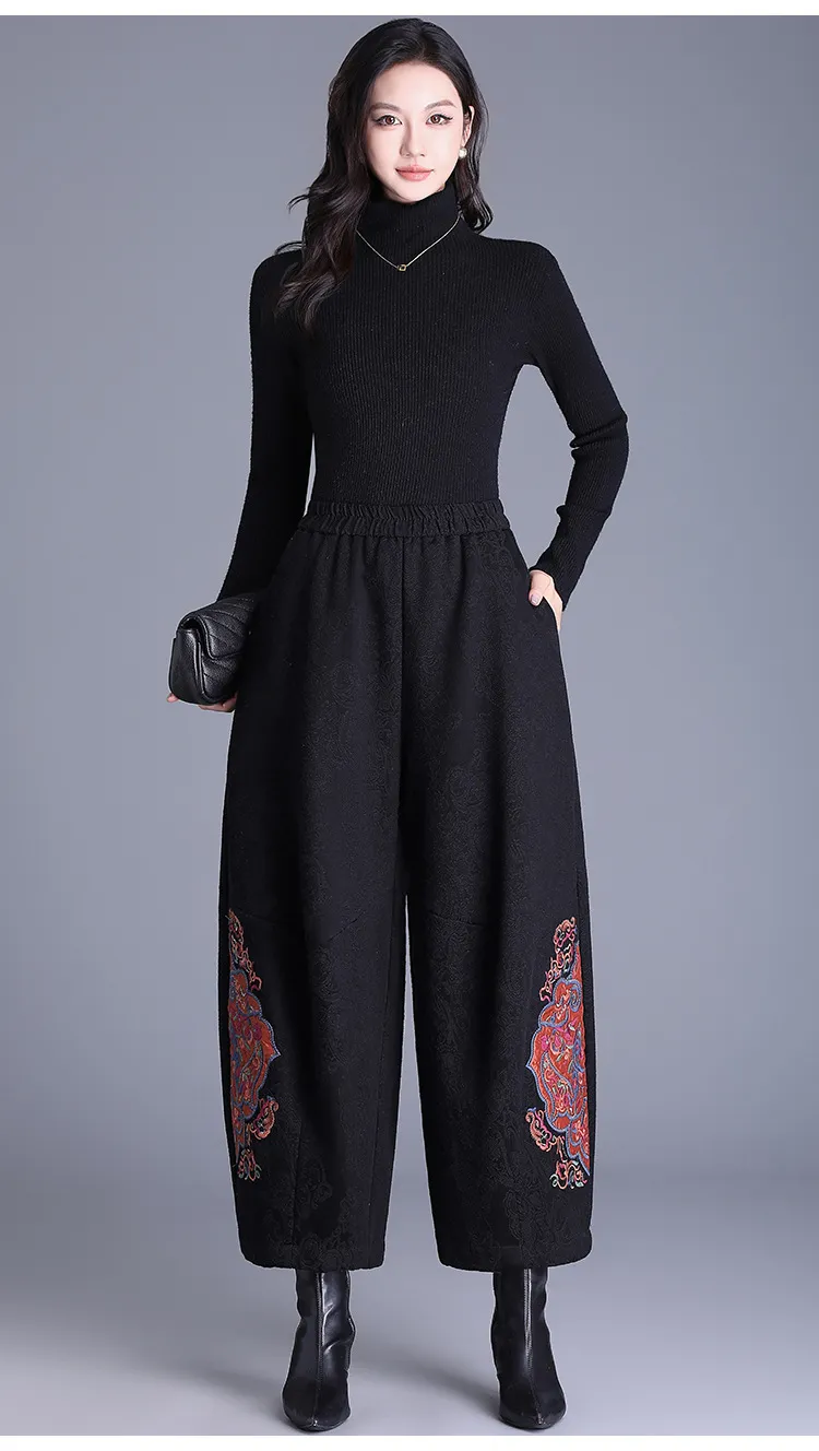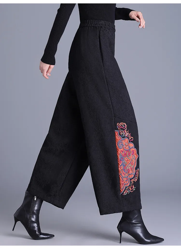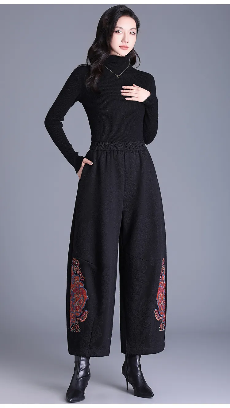 衣都精品- 新款高腰加絨重工刺繡提花闊腿褲