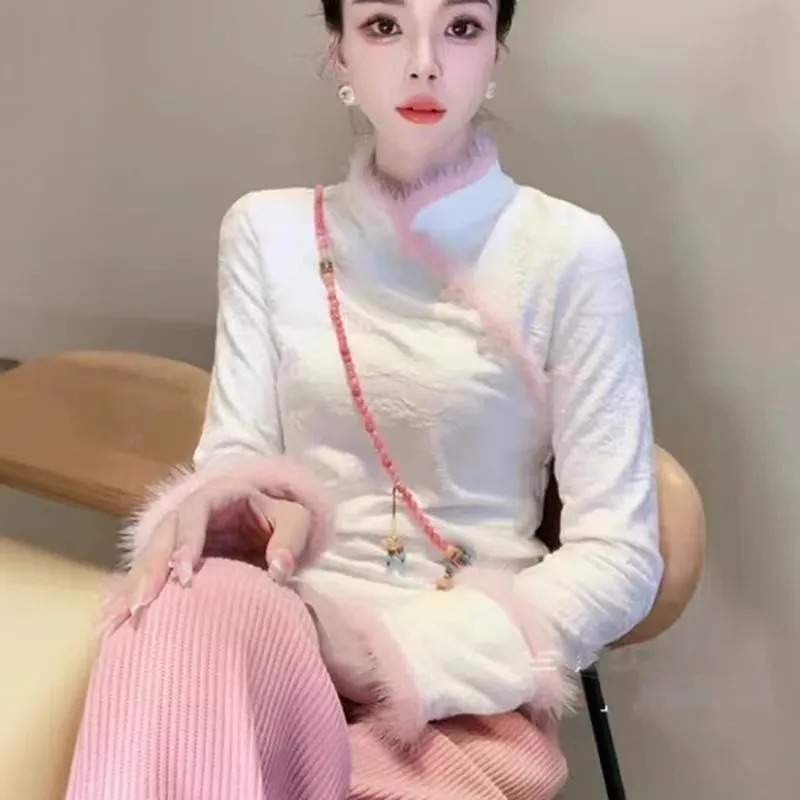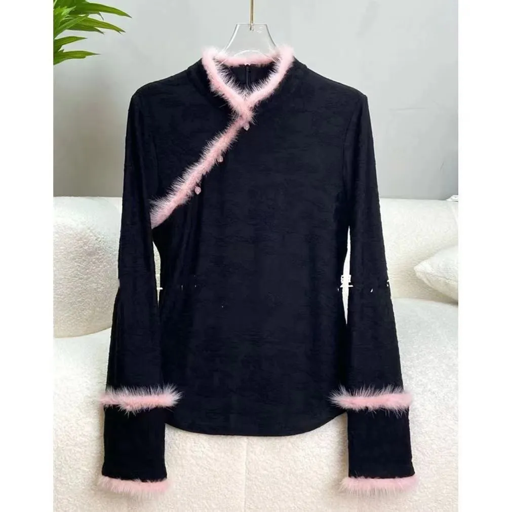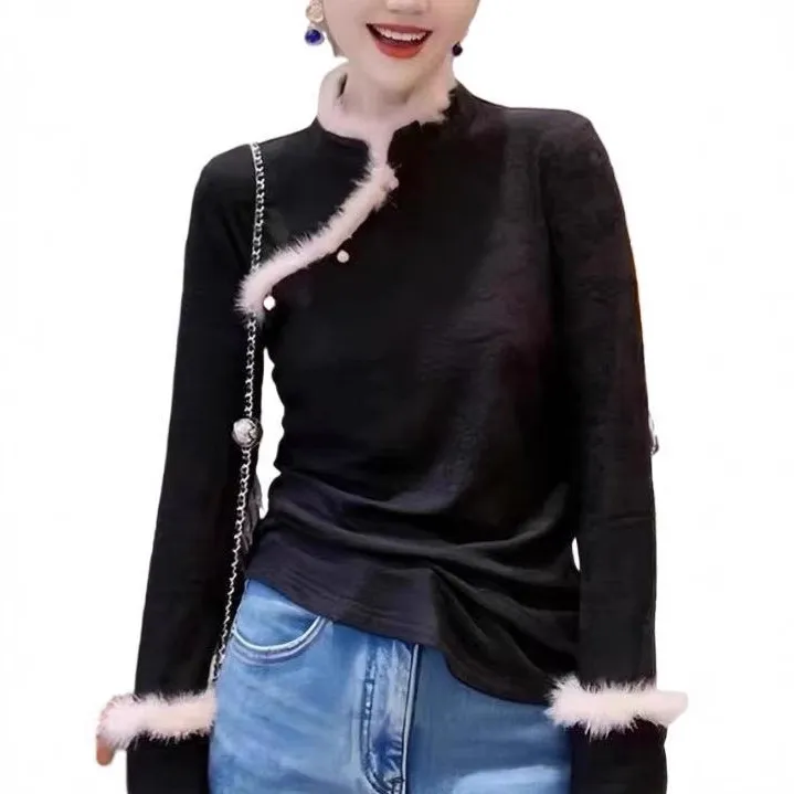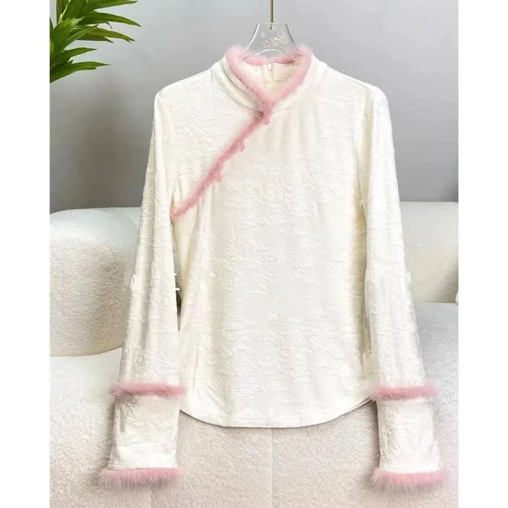 衣都精品- 新款復古斜襟提花加絨保暖氣質上衣