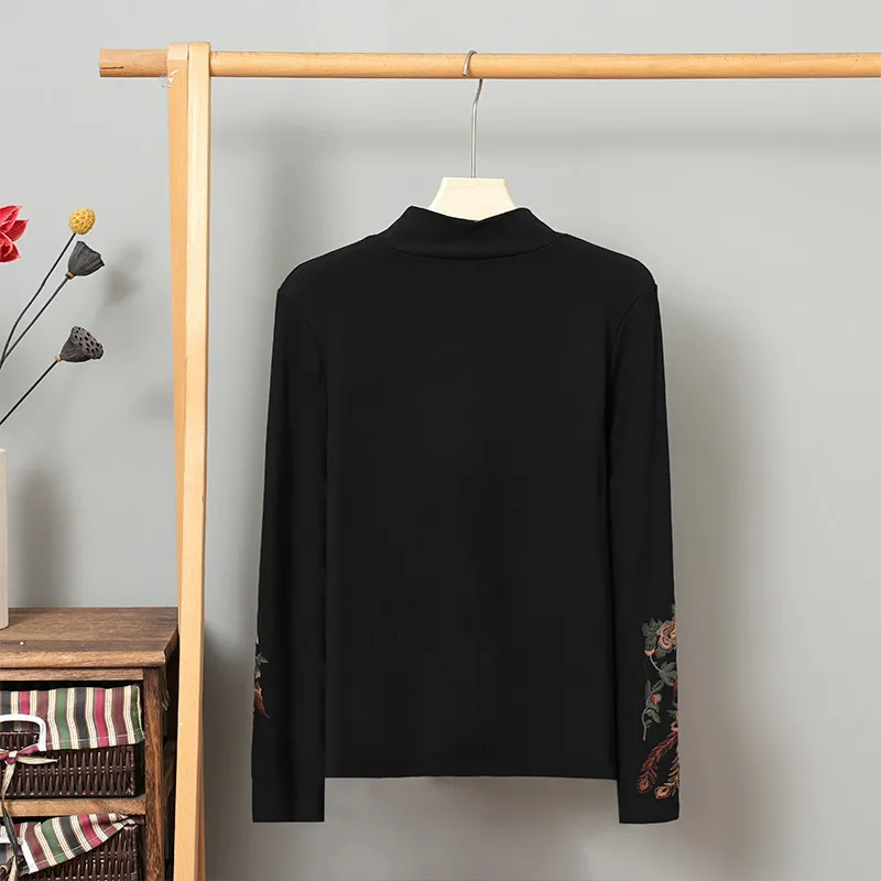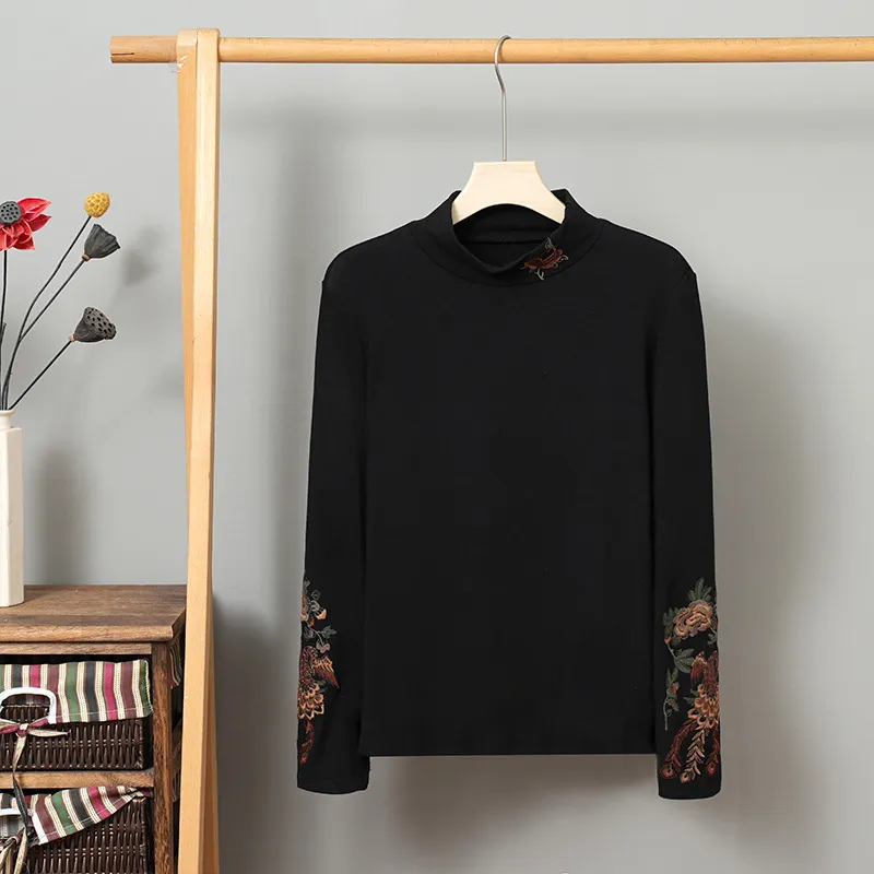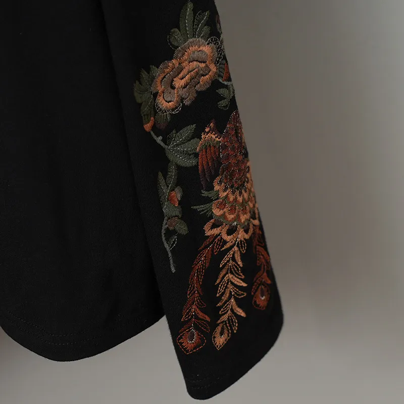 衣都精品- 新款文藝重工刺繡圓領長袖彈力上衣