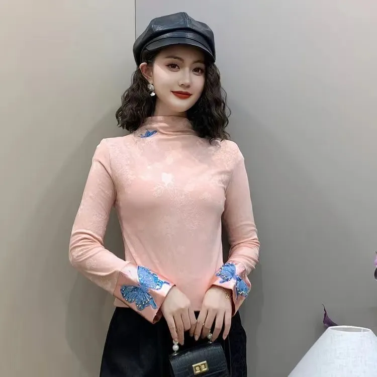 衣都精品- 新款時尚藍蝶翩翩半高領內搭上衣