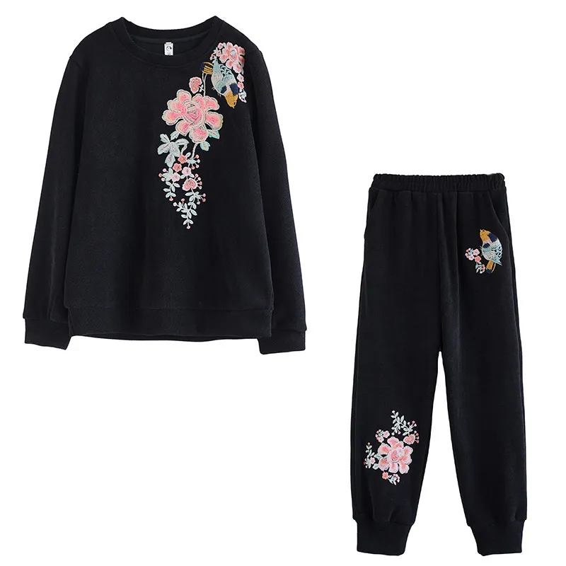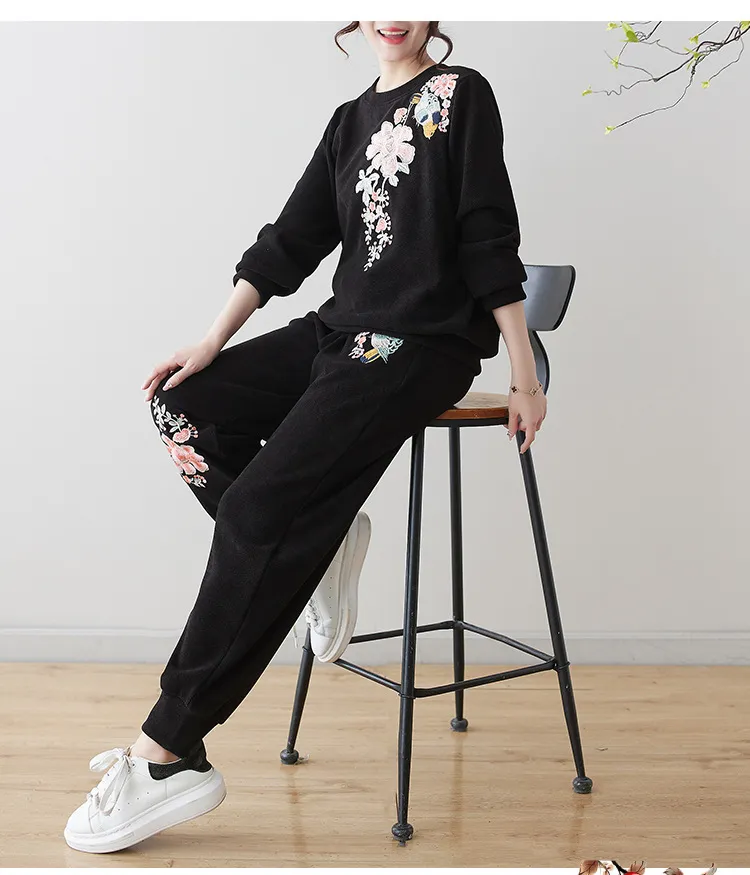 衣都精品- 新款復古繡花衛衣+哈倫褲休閒運動兩件式套裝