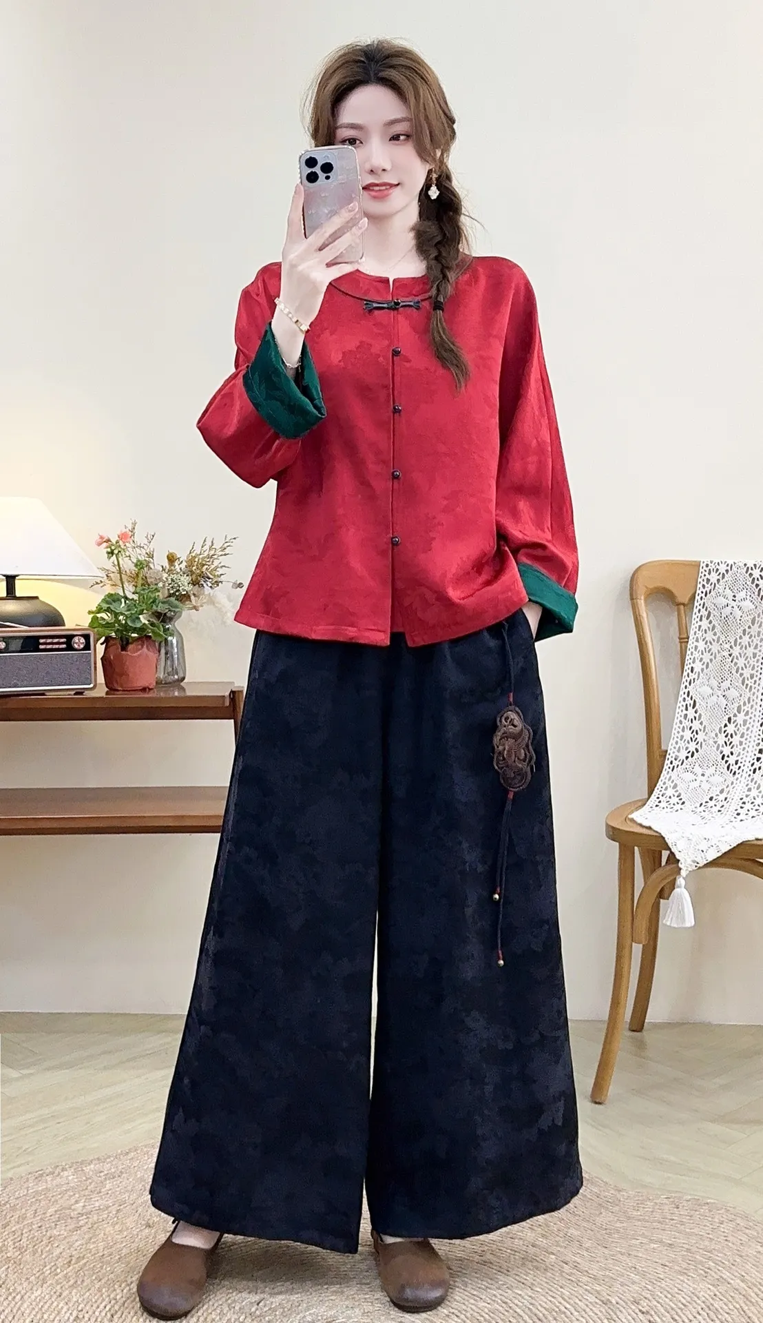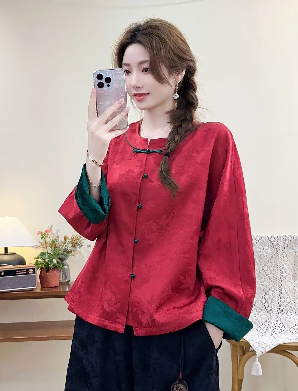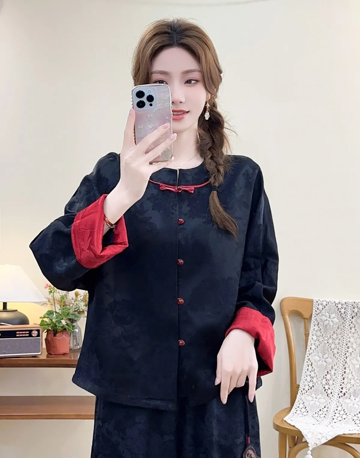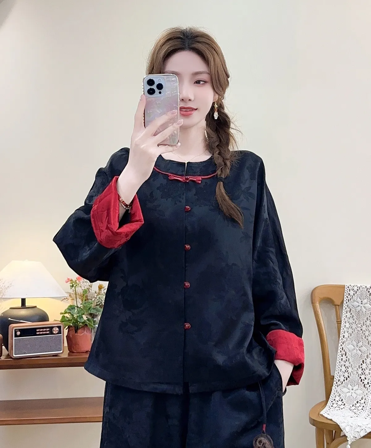 衣都精品- 新款民族風緞面提花撞色盤扣外套