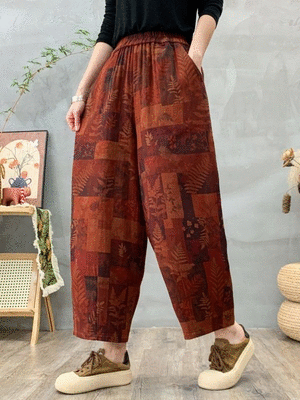 衣都精品- 新款民族風復古印花棉麻哈倫褲