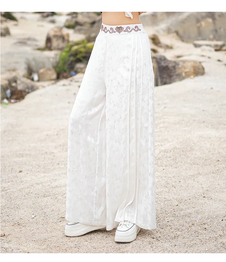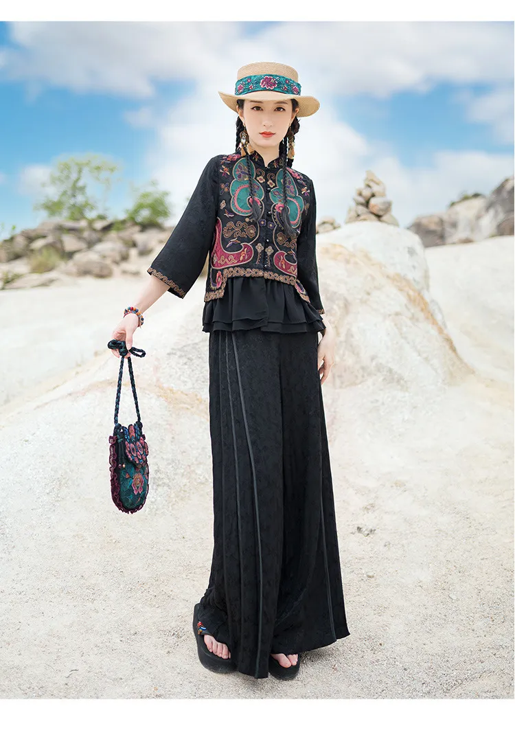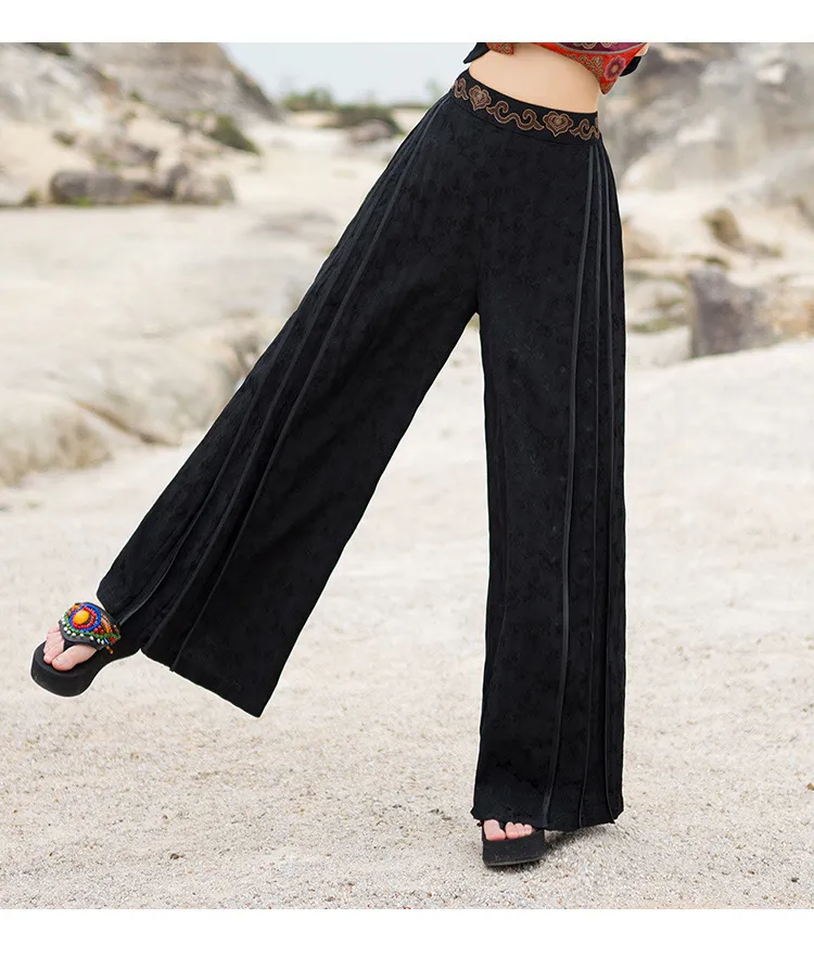 衣都精品- 新款民族風提花緞面繡花鬆緊腰闊腿褲