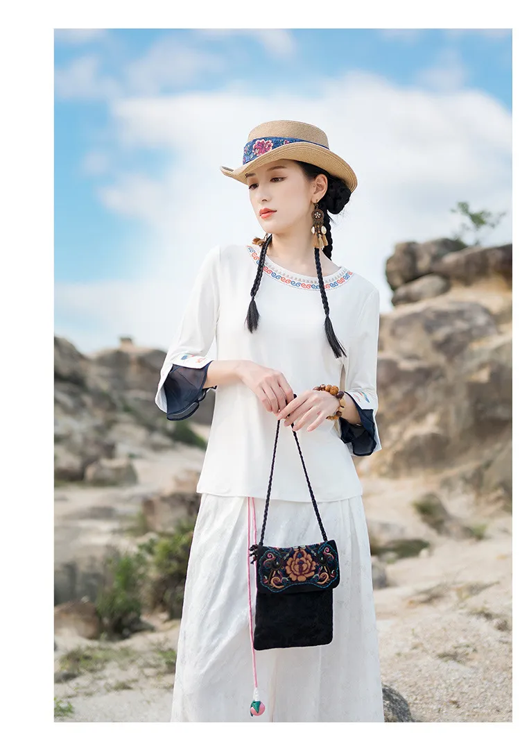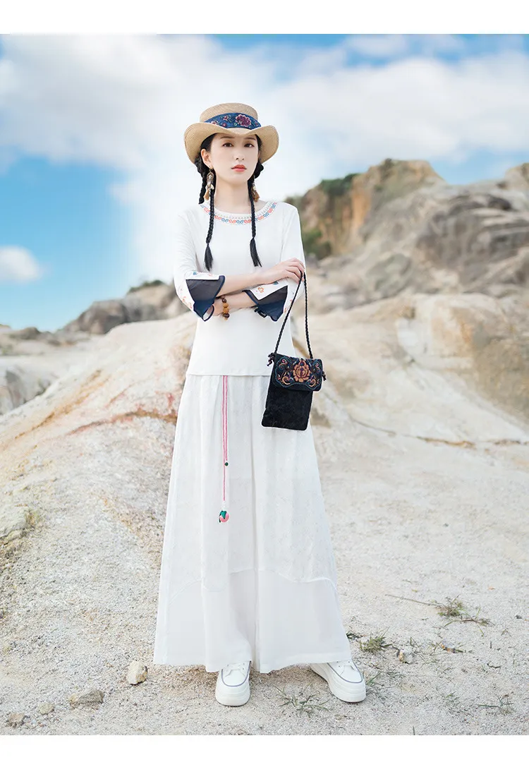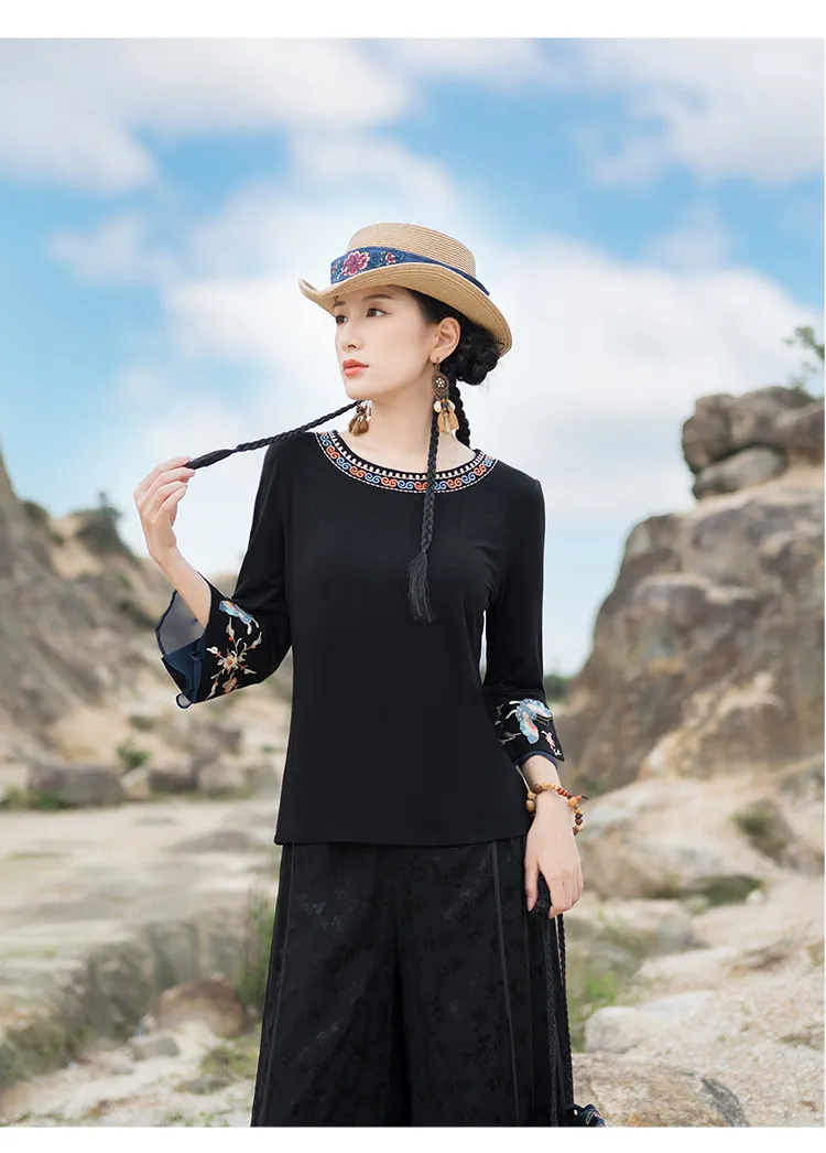 衣都精品- 新款民族風撞色刺繡圓領長袖上衣