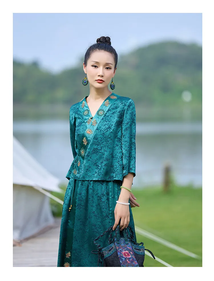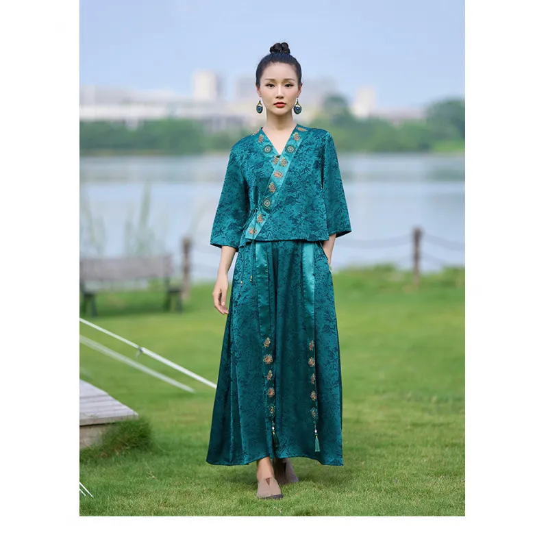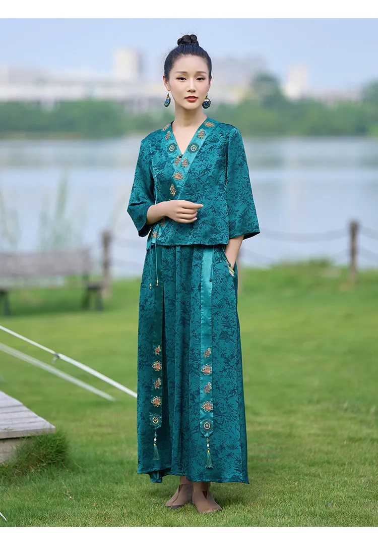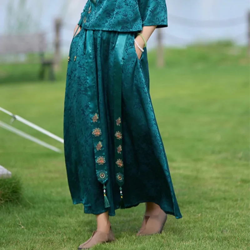 衣都精品- 新款民族風提花緞面繡花鬆緊腰闊腿褲