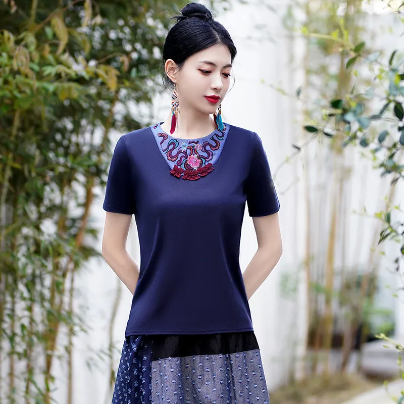 衣都精品- 新款復古刺繡百搭短袖上衣
