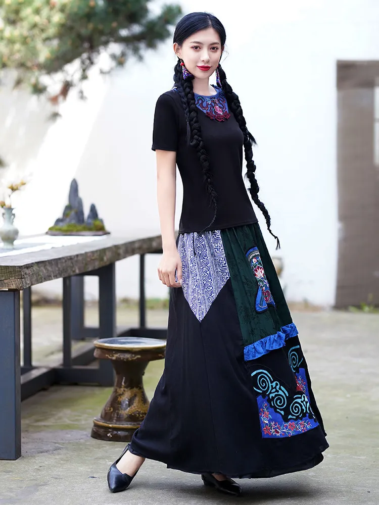 衣都精品- 新款民族風可拆卸飄帶繡花流蘇鬆緊腰半身裙